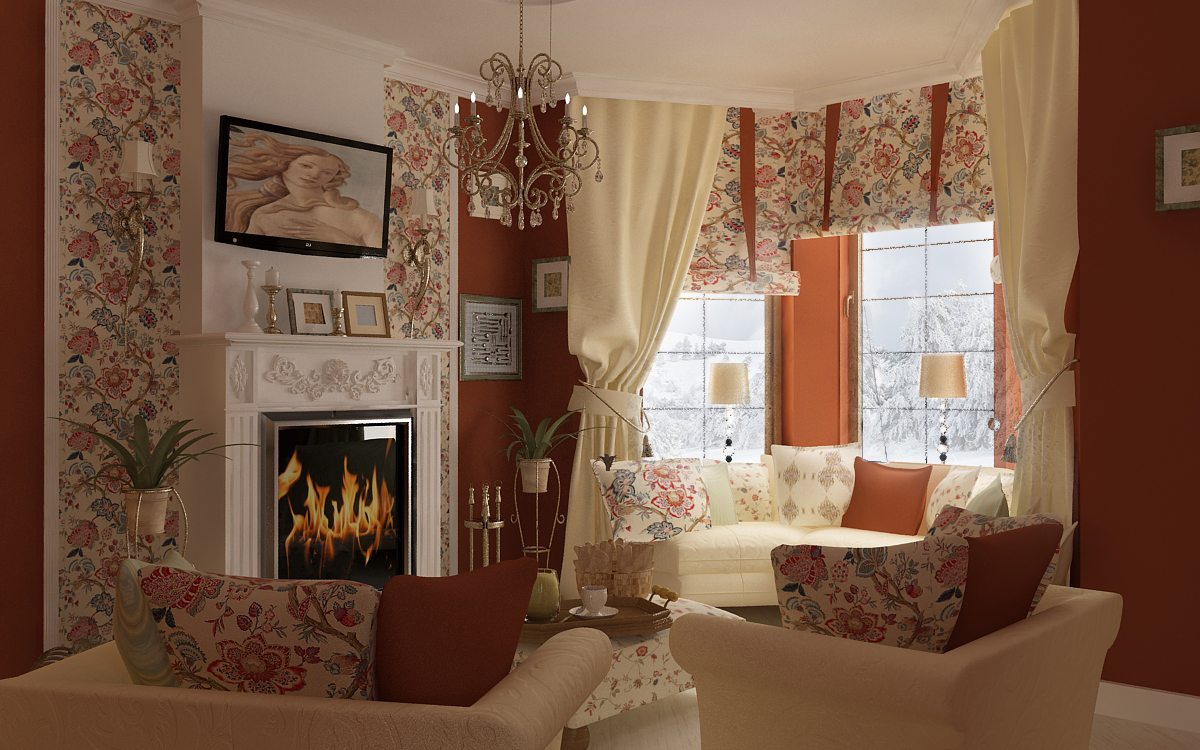 Un foyer électrique, une télévision, des vases de sol, des lampadaires s'intégreront parfaitement dans le projet de design. Pour la décoration intérieure, vous pouvez utiliser du papier peint avec un motif neutre.