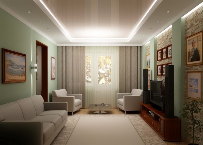 C'est bien quand il y a de hauts plafonds dans cette pièce - ils agrandiront visuellement le salon. Mais s'ils sont bas, leur finition doit être légère.