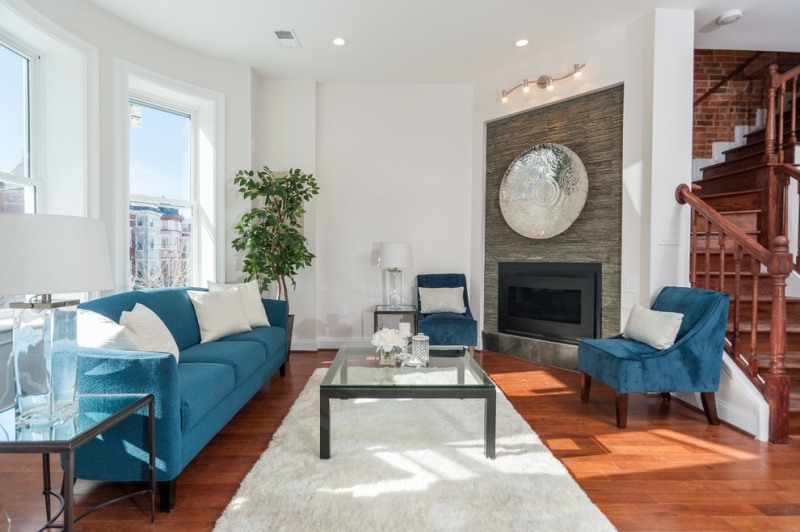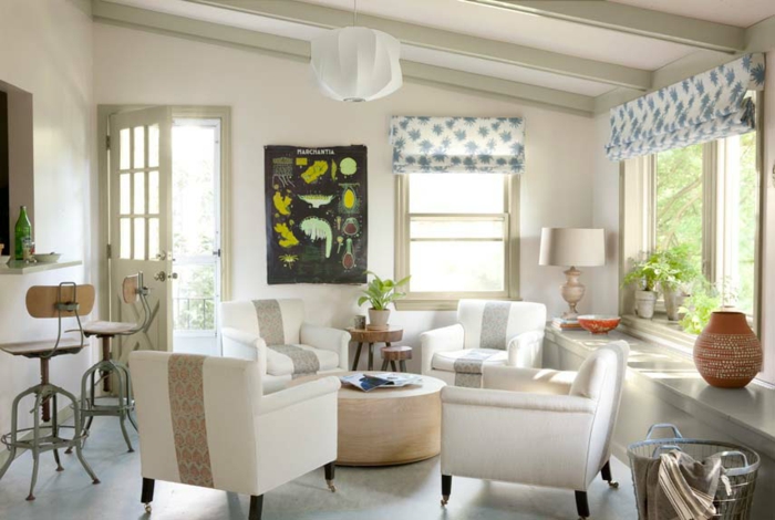 Des tons calmes, des nuances agréables, de beaux meubles confortables et d'autres détails intérieurs rendront la pièce confortable dans ce style. Pour ce style, les couleurs pastel claires de gris clair, beige, olive ou bleu sont considérées comme acceptables pour la décoration murale, qui peut être teintée de peintures ou de photographies. De petites tables, des poufs, des meubles simples et pratiques, des lampes ou des lustres insolites conviendront dans une telle pièce.
