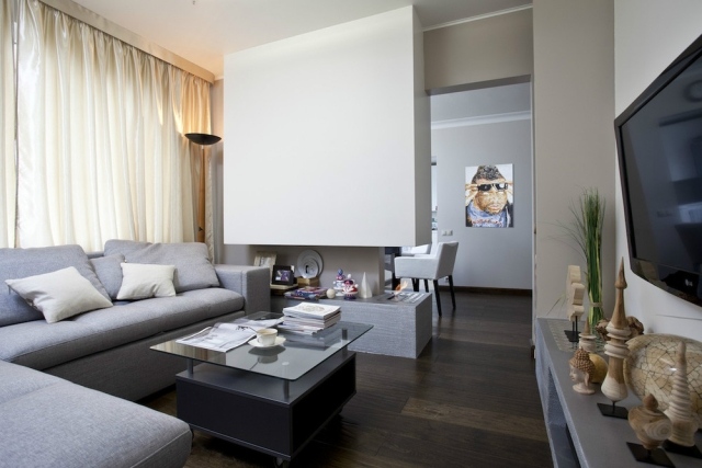 - Avec la forme carrée de la salle, vous pouvez placer des meubles de tous les côtés, en vous concentrant au milieu sous la forme d'une table basse.