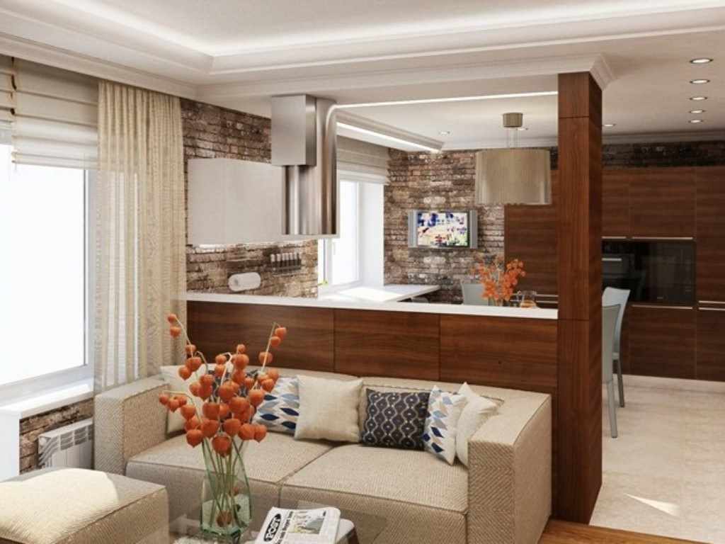 Les zones peuvent être divisées en utilisant différentes couleurs, meubles. Les concepteurs modernes recommandent de délimiter la pièce à l'aide du bar, il peut servir de table pour manger et de surface de travail.