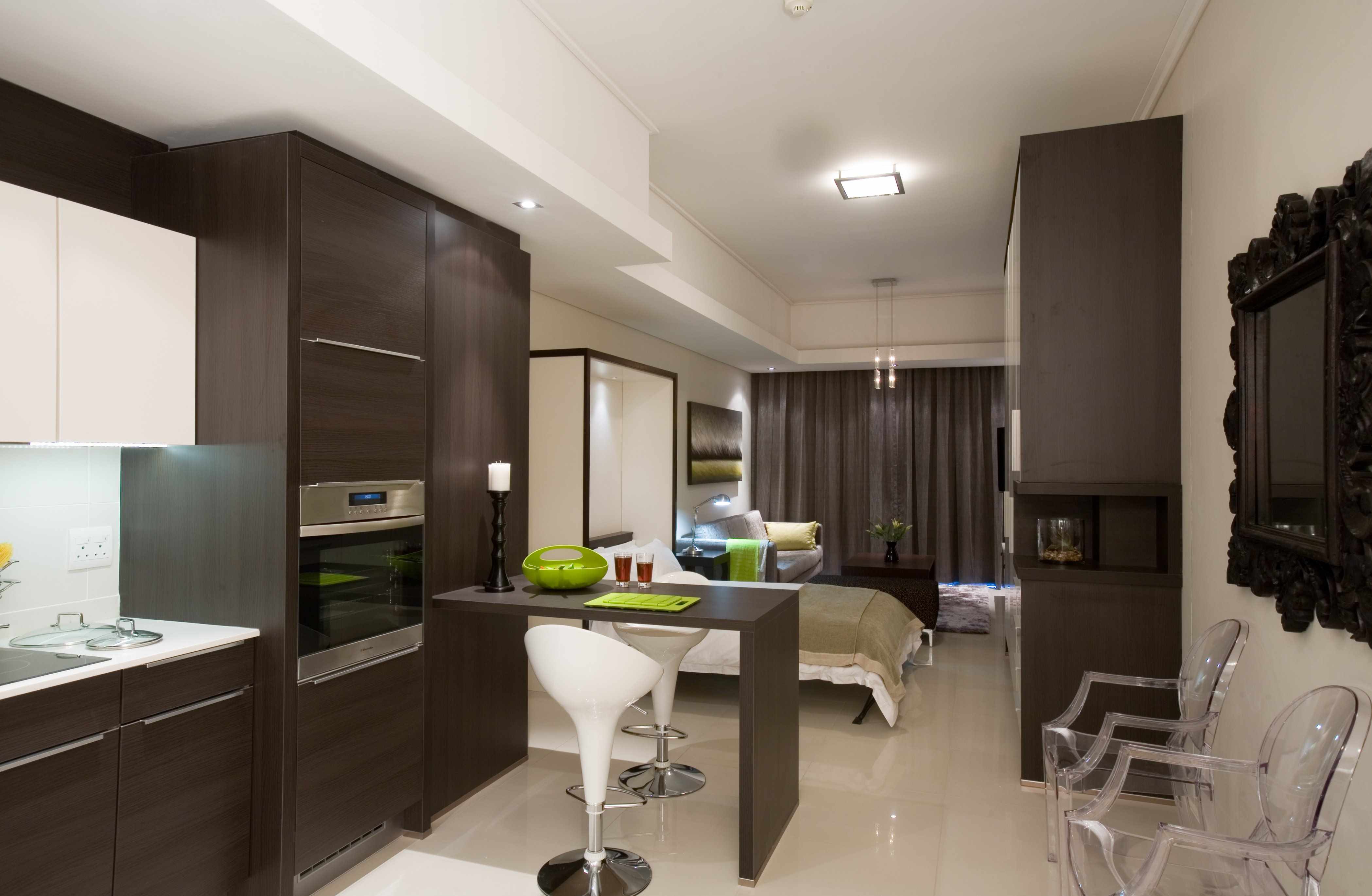 Si le noir et le brun prédominent dans la cuisine-salon, la pièce sera visuellement plus petite. Par conséquent, cette combinaison est mieux utilisée dans les pièces avec une grande longueur. Les couleurs claires, au contraire, augmentent l'espace, idéal pour les petites surfaces.
