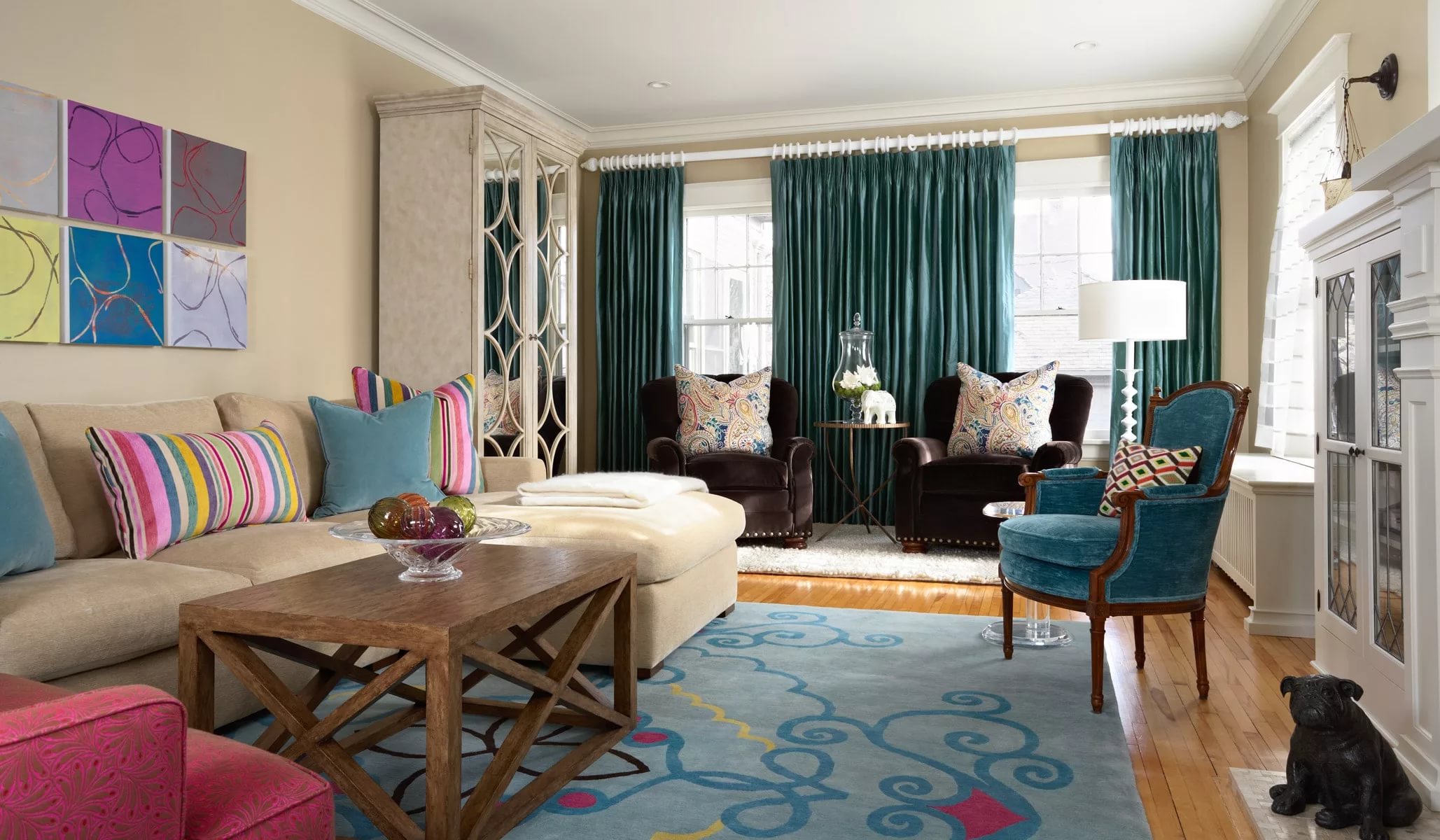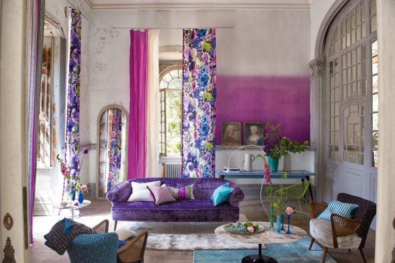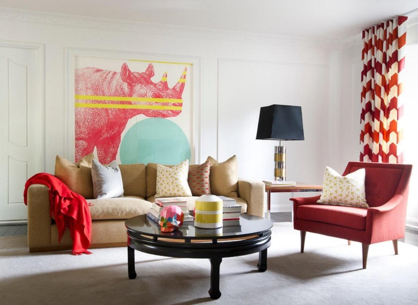 Lors du choix des couleurs vives, il est important de considérer leur interaction les unes avec les autres. En jouant avec la couleur, vous devez réfléchir à la texture et aux motifs des tissus. Par exemple, si la partie principale du salon est décorée d'imprimés ou d'un motif complexe, il est préférable de ne les répéter que dans de petits éléments décoratifs supplémentaires.