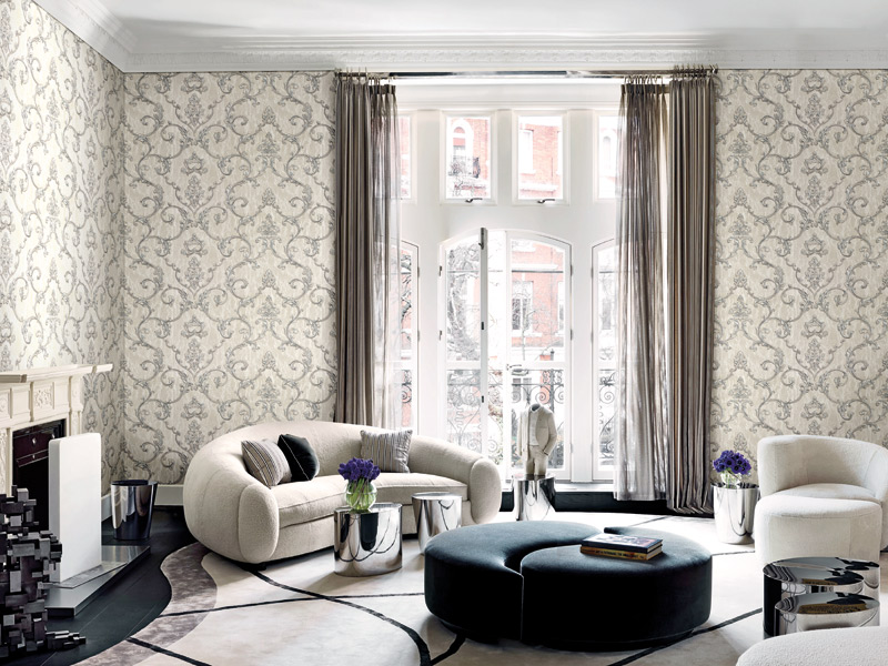 Dans la conception du salon avec des murs clairs, l'ensemble peut être choisi parmi le bois naturel ou les teintes sombres, dans des styles modernes voire noirs. Pour le papier peint avec des monogrammes sombres, un bois naturel garni de placage d'essences chères convient également.