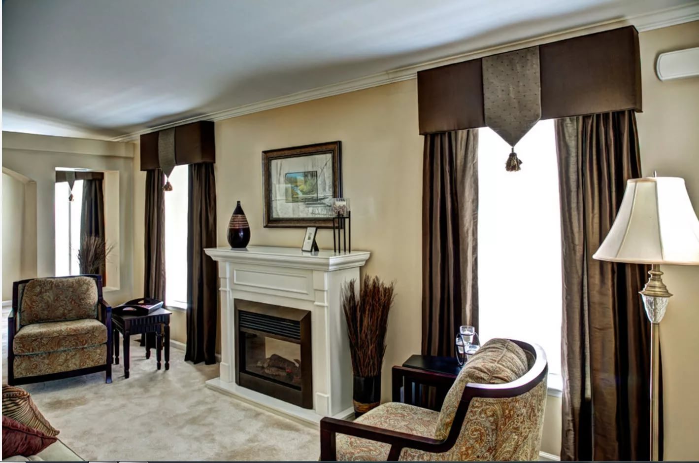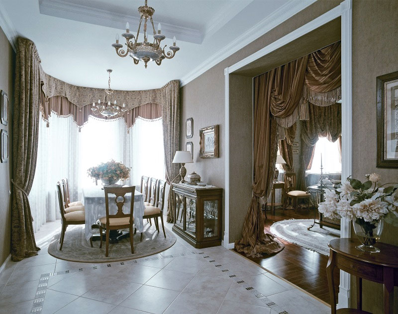 Décoration de fenêtre spectaculaire avec doubles rideaux et lambrequin dans le salon de style classique