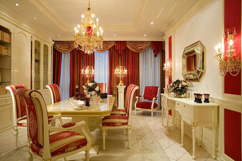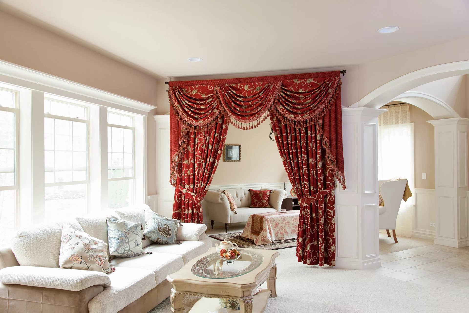 Les rideaux rouges vont bien avec un intérieur blanc dans un style classique