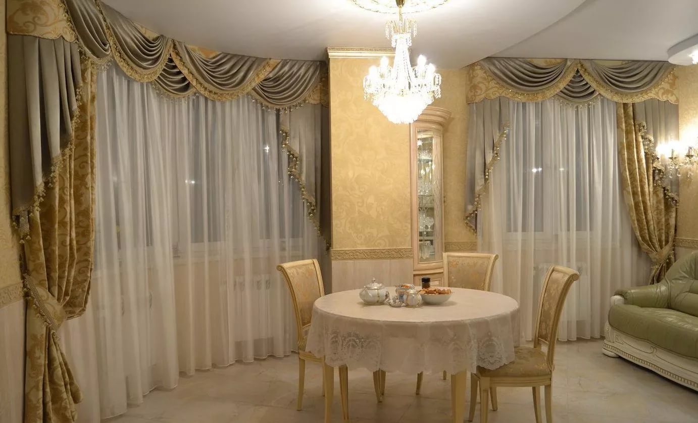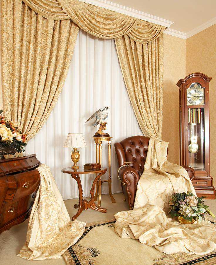 Des rideaux denses sont utilisés: velours ou satin. Couleurs primaires: beige, jaune, or, bleu, vert et violet. Dans le salon, vous pouvez utiliser des lignes strictes dans les dessins de rideaux sombres. La conception peut également contenir des détails précis et accrocheurs.