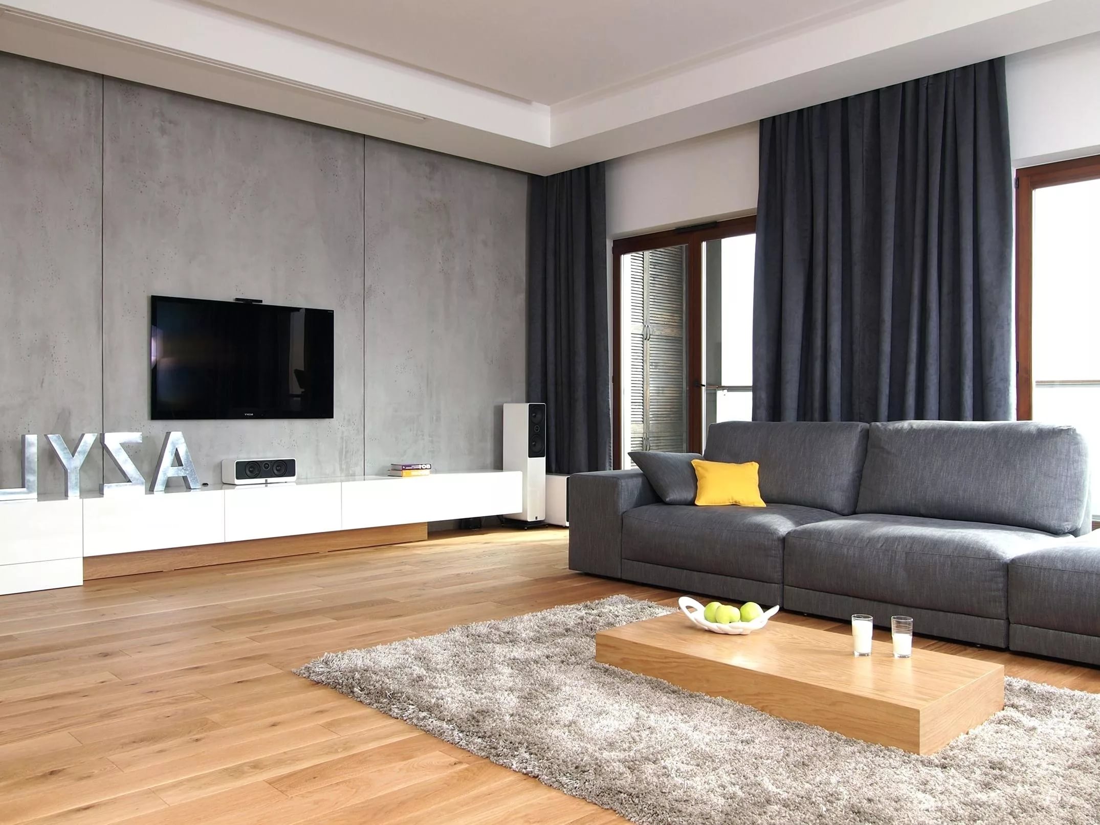 Rideaux gris à l'intérieur uni d'un salon moderne