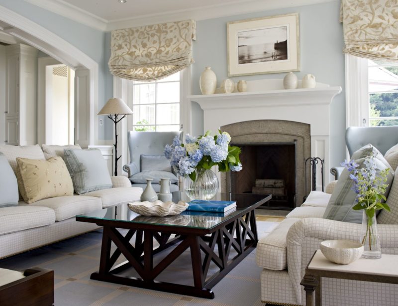 Mieux vaut l'utiliser dans des pièces grandes, spacieuses et lumineuses. Si des papiers peints clairs et des meubles sombres dans le hall, quels rideaux seront plus attrayants? Le bleu à l'intérieur se détend, rend la pièce plus fraîche. Des nuances de jaune et de beige aideront à adoucir cette situation.