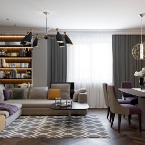 Dans les intérieurs modernes classiques, l'utilisation d'un plafonnier central est obligatoire. La sélection des lustres est un espace pour l'imagination du designer. Les lampes d'exécution laconiques créeront une harmonie entre les différentes zones du salon, et un grand lustre original sera une finition brillante du décor, comme une cerise sur un gâteau.