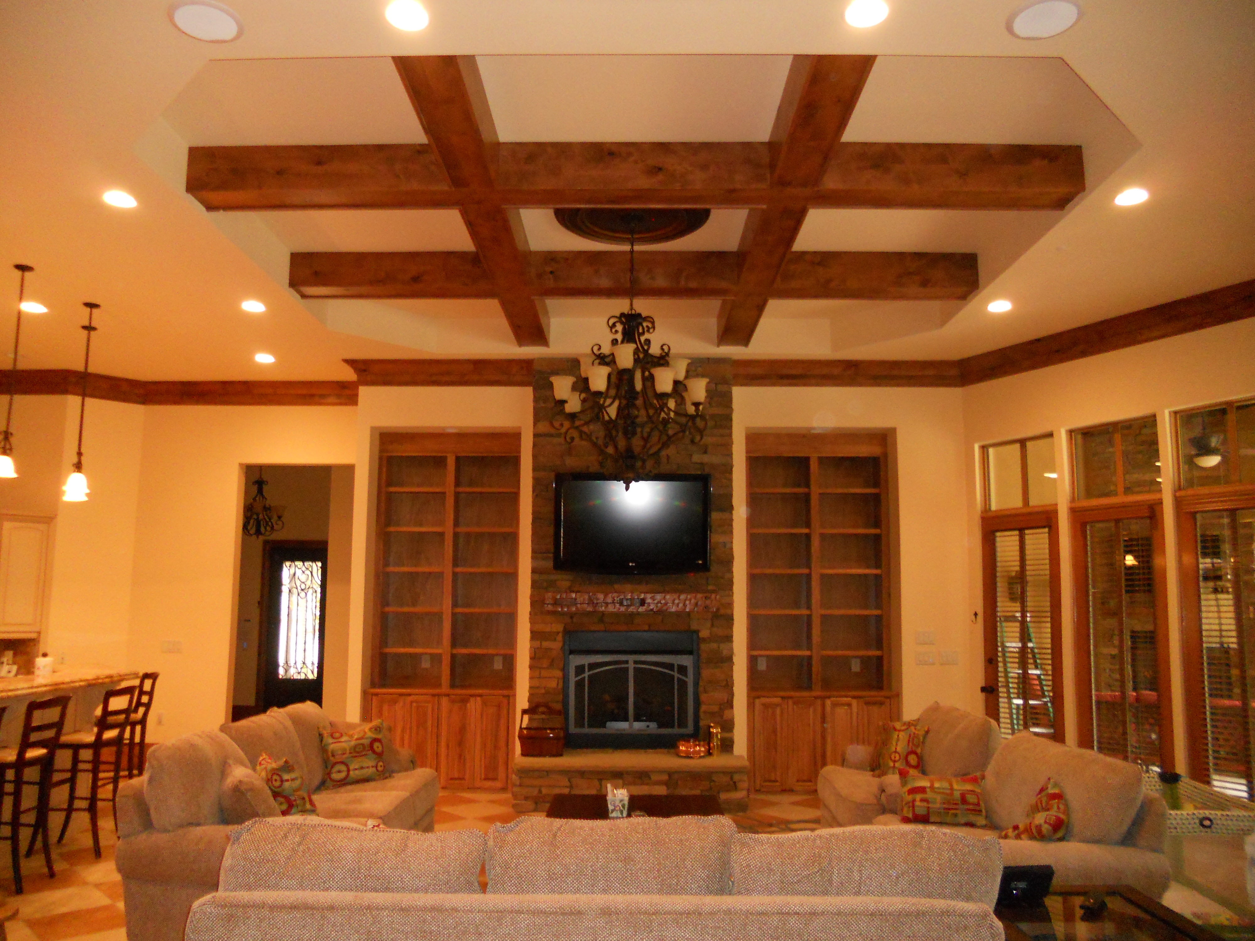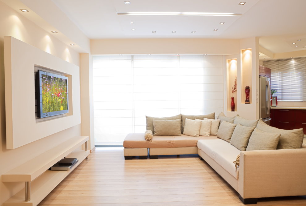 L'éclairage situé autour du périmètre du plafond crée un éclairage à deux zones dans le salon