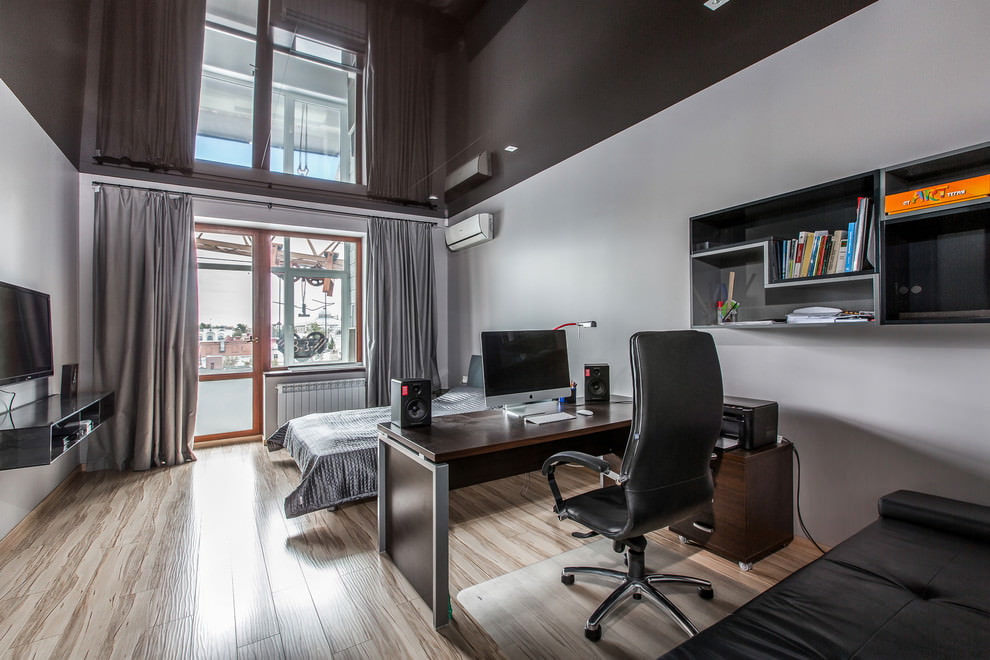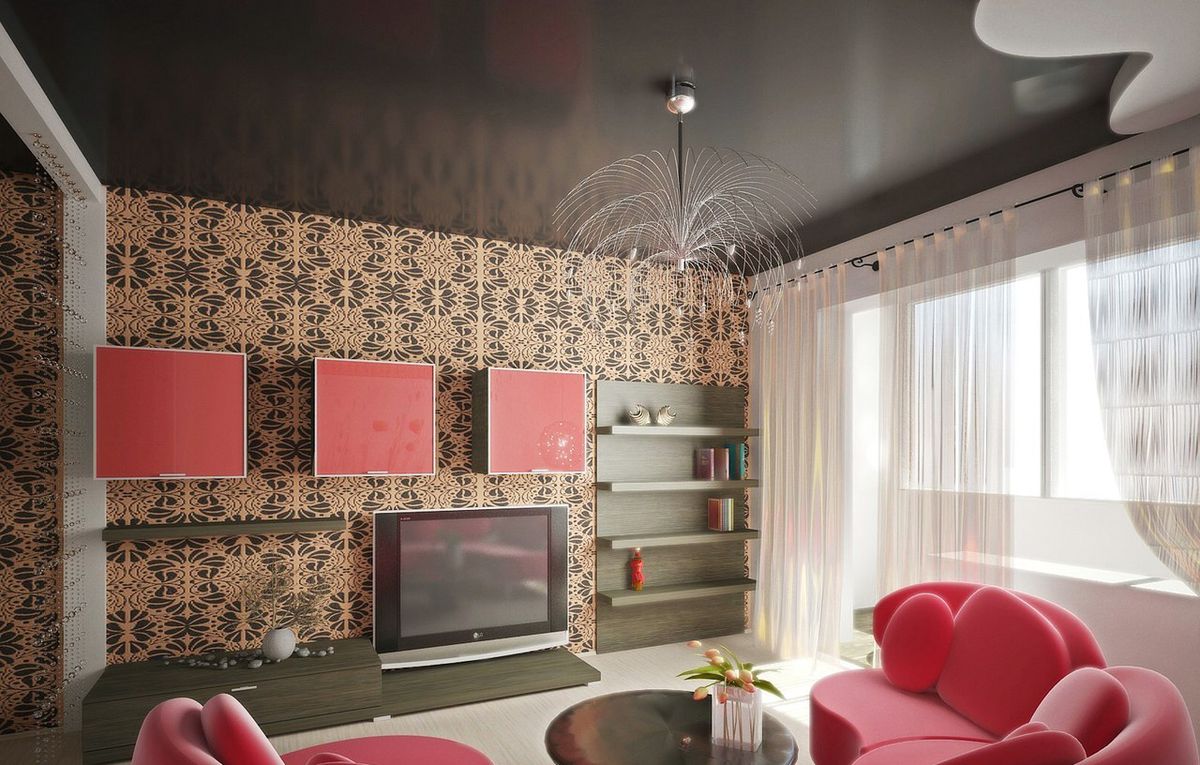 Le film est réalisé dans presque toutes les couleurs.Et même le plafond noir s'intégrera facilement à l'intérieur du salon, l'essentiel est de développer initialement un projet de design professionnel.