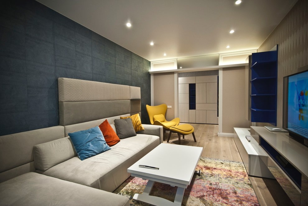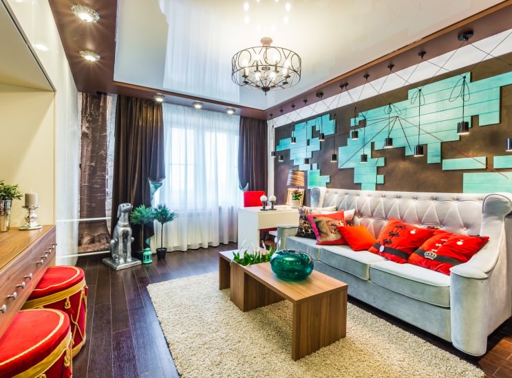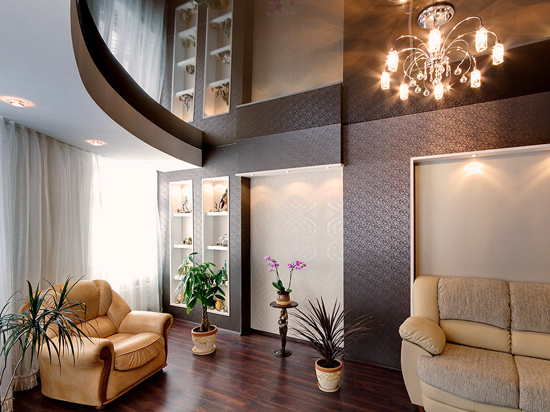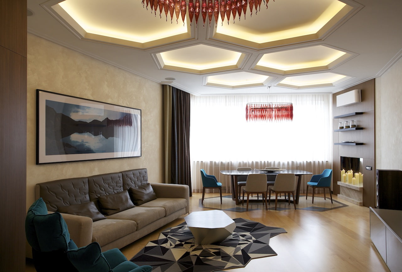 Les solutions de conception modernes vous permettent de rendre le salon beau et confortable de tous les côtés. Le plafond peut être conçu dans un style sobre, de sorte qu'il ne sert que d'arrière-plan pour le reste de l'intérieur. Ou faites-en le centre de la composition, brillant et accrocheur.