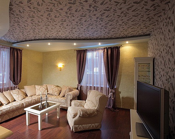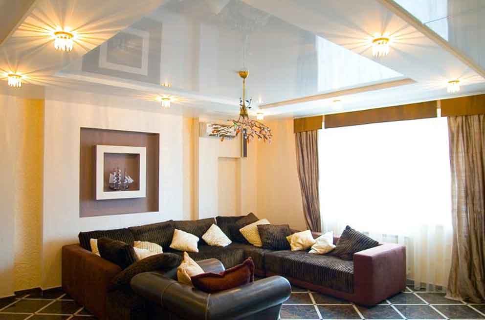Vous pouvez évaluer la conception du plafond dans le salon à l'aide de la photo. Cela donnera une impression générale de la combinaison de couleurs et de formes des modèles les plus courants. Les catalogues des fabricants et installateurs indiquent tous les types de revêtements et leurs prix.