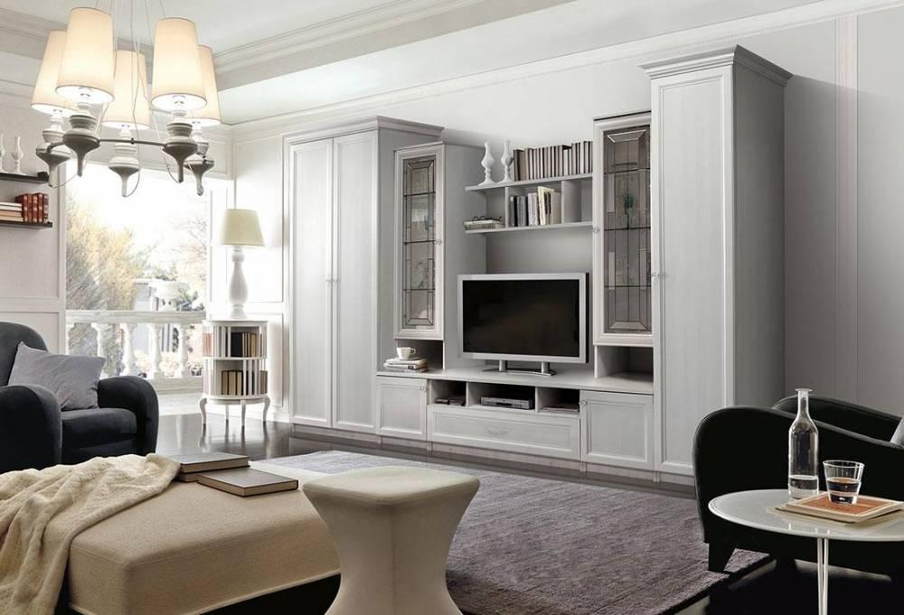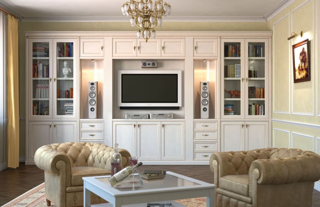 Un ensemble de meubles pour un salon spacieux est très vaste.Il s'agit d'un meuble mural ou d'un toboggan dans le hall, d'un ou deux canapés, une paire de fauteuils, des tables de différentes tailles et usages, des consoles, des commodes, des armoires murales, des étagères.