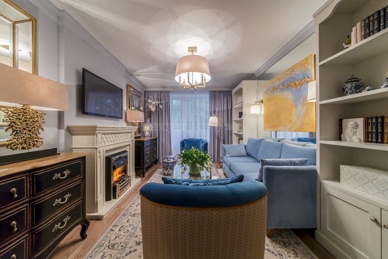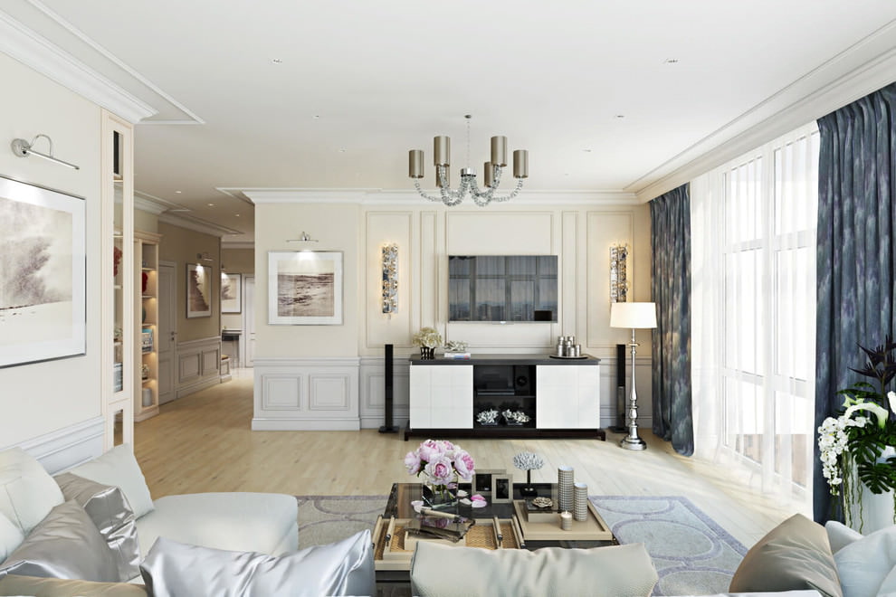 De beaux meubles rembourrés à l'intérieur de la salle sur la plupart des photos ont l'air luxueux, festif, cher. L'un des murs, traditionnellement, est décoré d'un immense écran de télévision avec plusieurs étagères étroites, un portail de cheminée en dessous. En face du téléviseur se trouve un canapé en forme de C, qui peut facilement accueillir toute la famille et plusieurs invités en même temps.