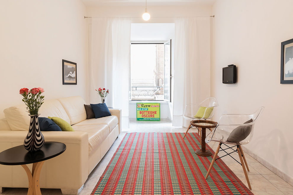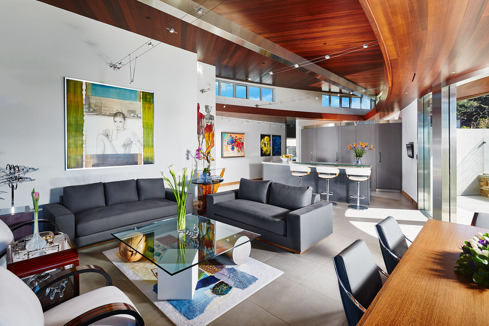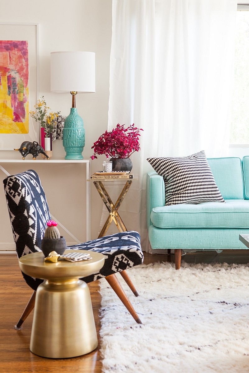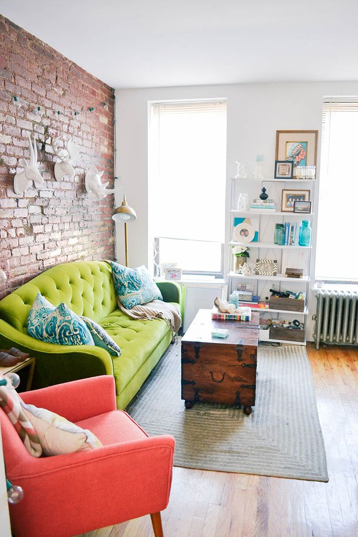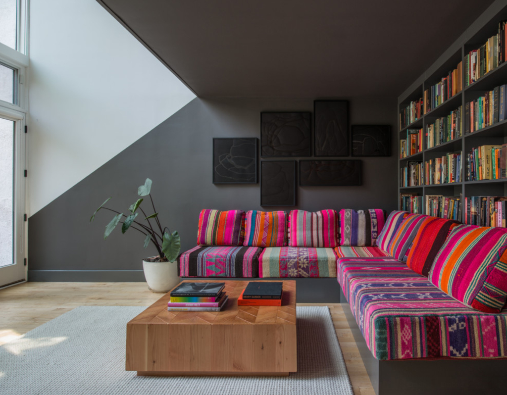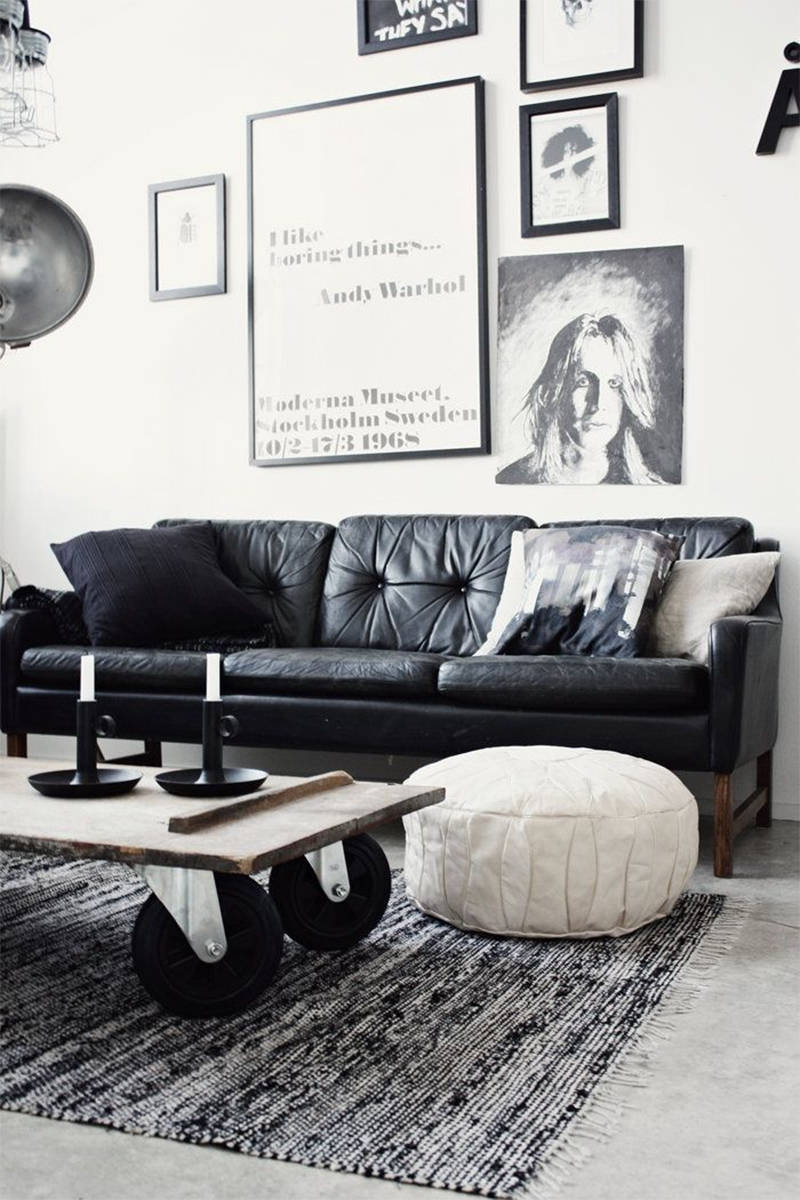 Le mur blanc rend la pièce plus lumineuse et se marie bien avec les meubles rembourrés de toute teinte sombre