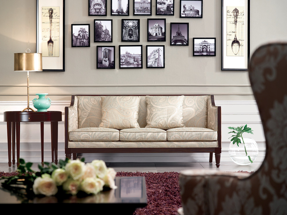 - Classique La table à manger de cette pièce a des pieds ciselés, elle est solide, massive, stable. Le mur-meuble est allégé, reposant sur des «pieds» bouclés, richement décorés de faux fil. Tapisserie d'ameublement rembourrée - tissu de tapisserie, cuir véritable, velours, velours.