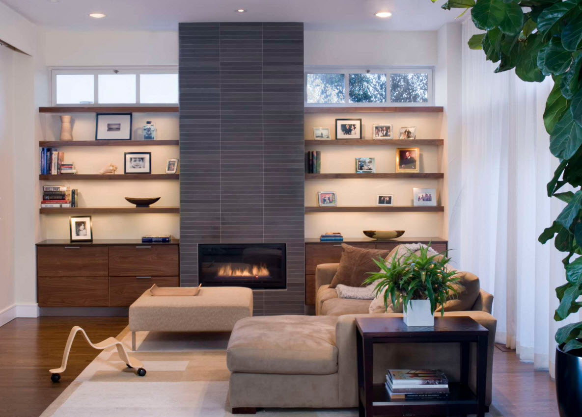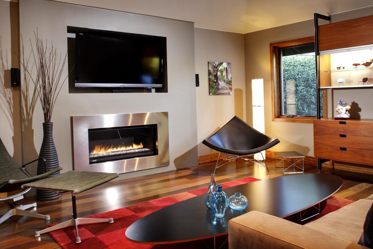 Un petit salon très confortable avec une cheminée surélevée et une table basse compacte