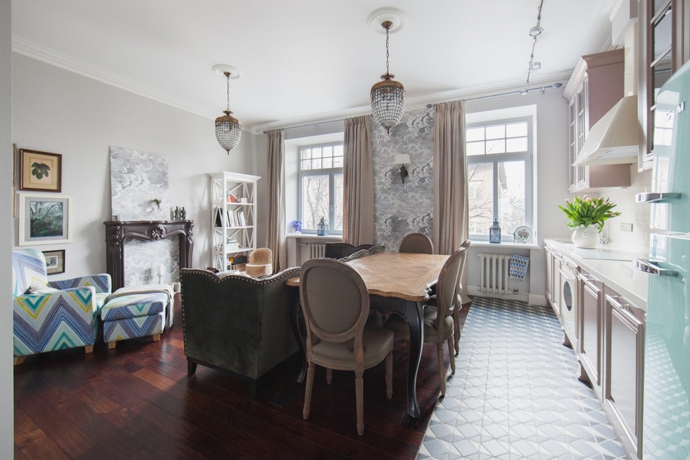 - Éclectisme. Convient aux amateurs de combinaison de styles, s'ils sont des personnalités créatives modernes avec un grand goût. La base est des couleurs claires, ce qui vous permet de combiner meubles, décoration, accessoires de différentes directions. Il est plus facile de combiner des objets de la même forme lorsqu'une partie du décor est de la même couleur, par exemple des rideaux et des tissus d'ameublement.