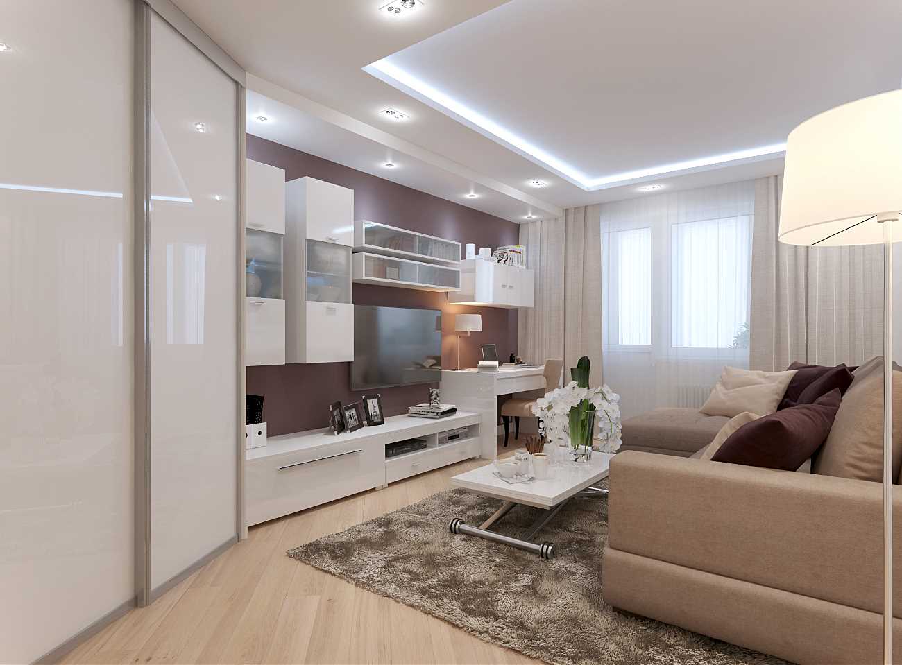 Le salon rectangulaire est dû à l'accent mis sur l'une des parties. Le long du mur, vous pouvez placer une grande armoire, un canapé. Le deuxième côté est utilisé de façon minimale - étagères suspendues, télévision à écran plat. S'il y a un balcon, le passage doit être libre. La conception d'une pièce rectangulaire est très dépendante de son allongement. Les salons très étroits peuvent être divisés en zones en se combinant avec un balcon ou en utilisant des écrans.