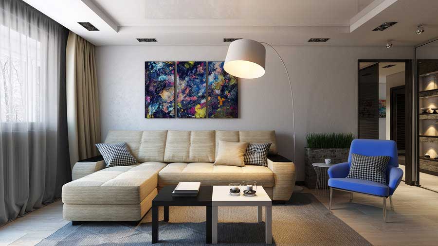 Conception de salon dans 19 mètres carrés. mètres oblige à utiliser tous les outils de planification. Une réparation bien faite est facile de gâcher la mauvaise sélection d'articles d'intérieur.