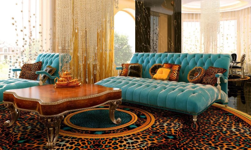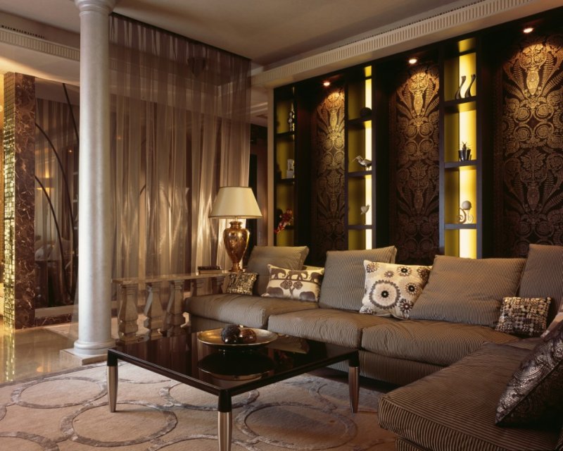 Des meubles en bois sombre, des éléments en bronze et en or, un imprimé de meubles de style africain et une décoration lumineuse et lumineuse au sol et au mur rendent le design d'une telle pièce unique, agressif et à la fois calme et élégant. Dans la fabrication du sol, des matériaux naturels ont été impliqués - le marbre, qui complète l'intérieur avec sa beauté froide et son chic chic.