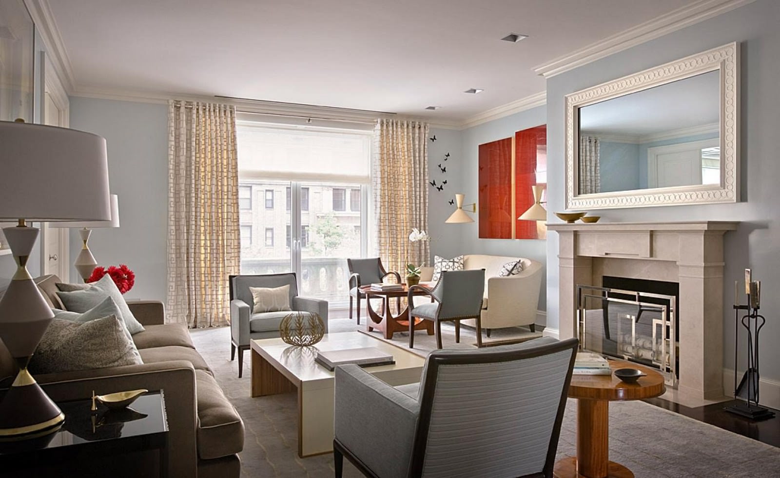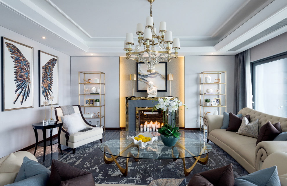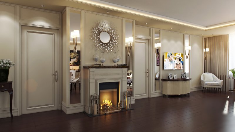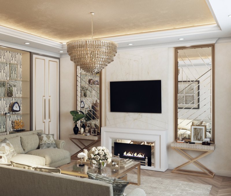 Le salon dans le style art déco sera parfait avec une cheminée, qui deviendra un élément chic. Lors du choix des matériaux pour les rideaux, il sera préférable d'utiliser des textiles riches, à savoir la soie, le satin ou le velours. Le tapis confère également à la chambre une sophistication et une élégance uniques.