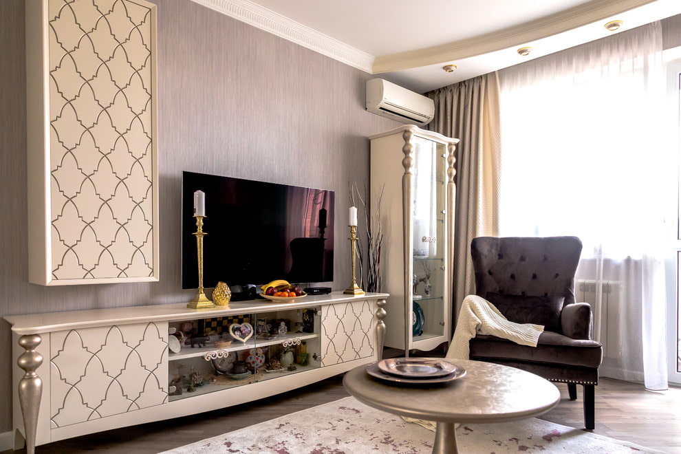 Si le salon est petit, agrandissez-le visuellement si des couleurs claires prédominent à l'intérieur. En outre, un mur peut être assombri, tandis que d'autres peuvent être combinés avec des tons plus calmes. Si les fenêtres de la pièce sont orientées au sud, vous pouvez faire prédominer le blanc et le marron, et si les fenêtres orientées au nord, le bleu et le beige seront esthétiquement beaux.