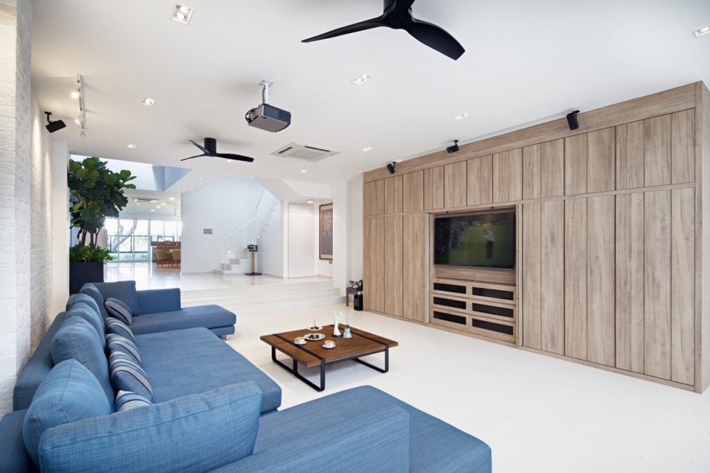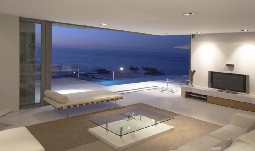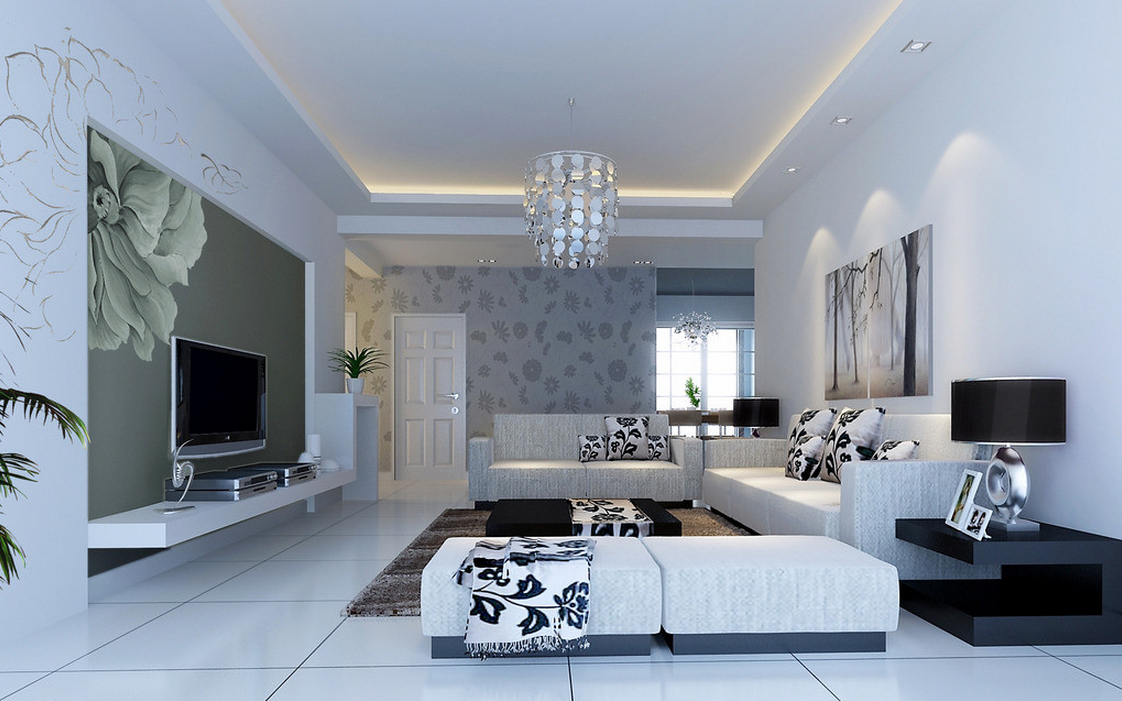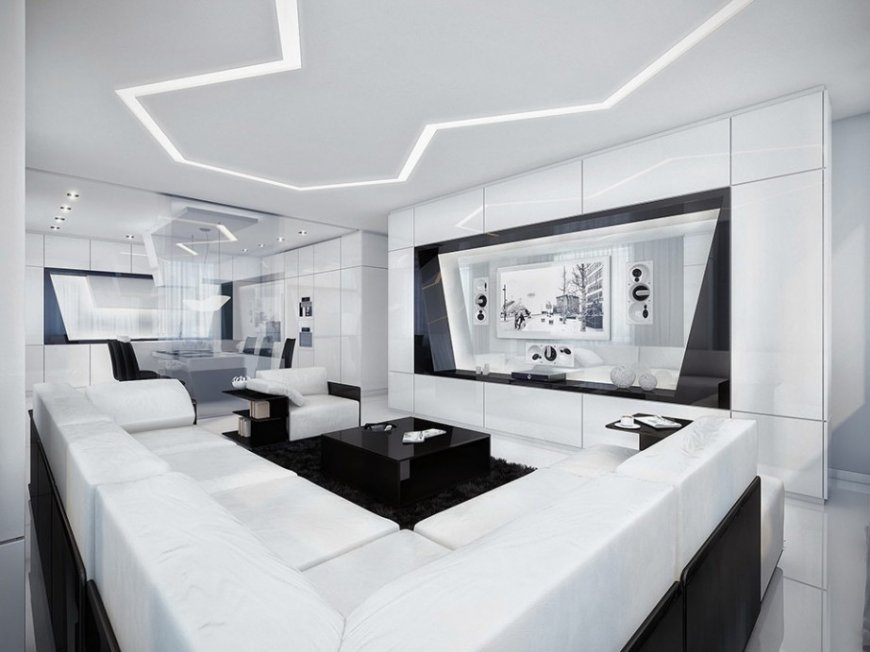 La conception du plafond du salon dans un style minimaliste suggère une surface parfaitement plate et blanche.
