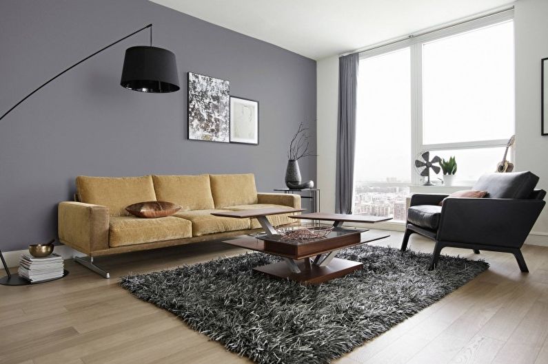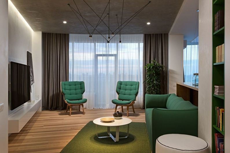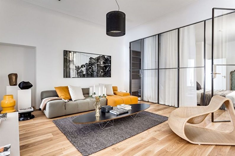 Le minimalisme à l'intérieur du salon vous permet de transformer cette pièce en une pièce pouvant remplir plusieurs fonctions à la fois.