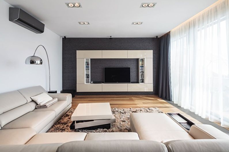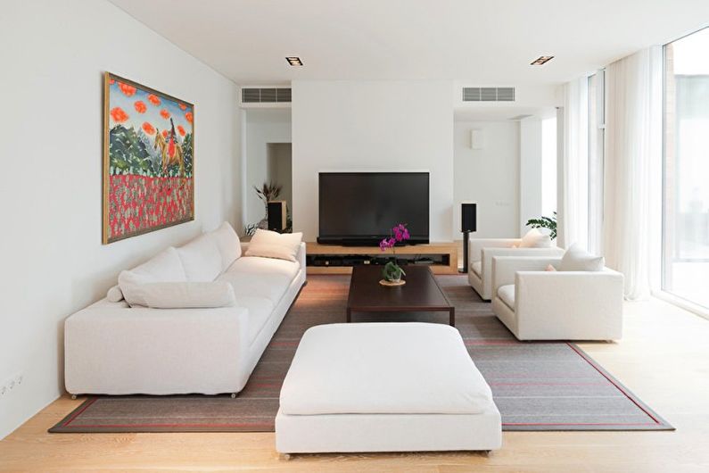 Le style minimalisme dans la conception du salon peut être utilisé à n'importe quelle taille.