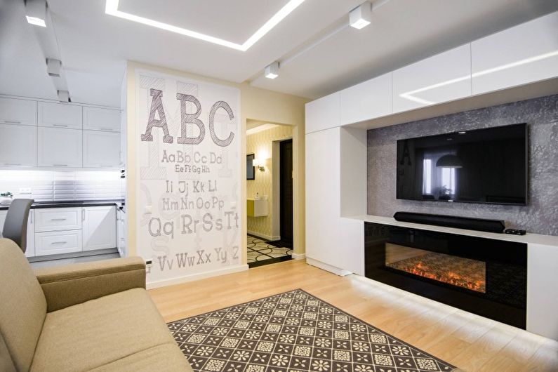 Lorsque vous concevez un salon moderne dans le style du minimalisme, vous devez abandonner le papier peint avec un motif.