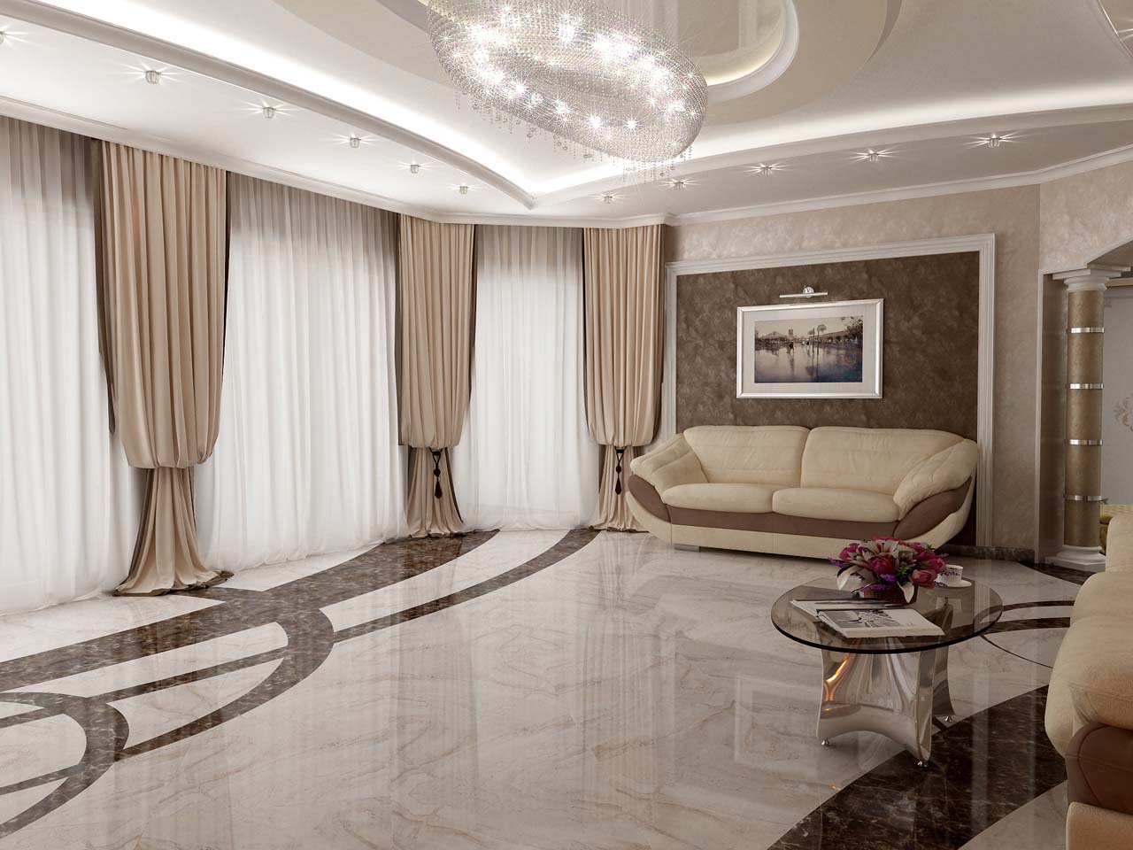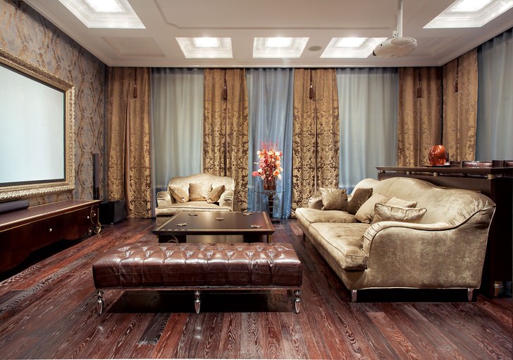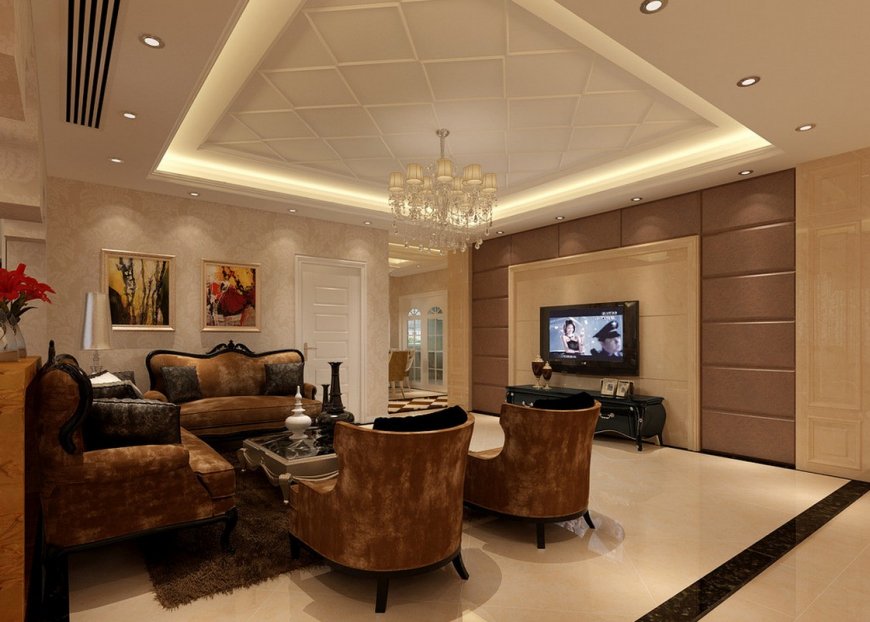 Le plus souvent, le plafond du salon est de style néoclassique dans des couleurs vives. Sa couleur doit correspondre à la teinte de base des murs. Pour la décoration, utilisez les éléments suivants: