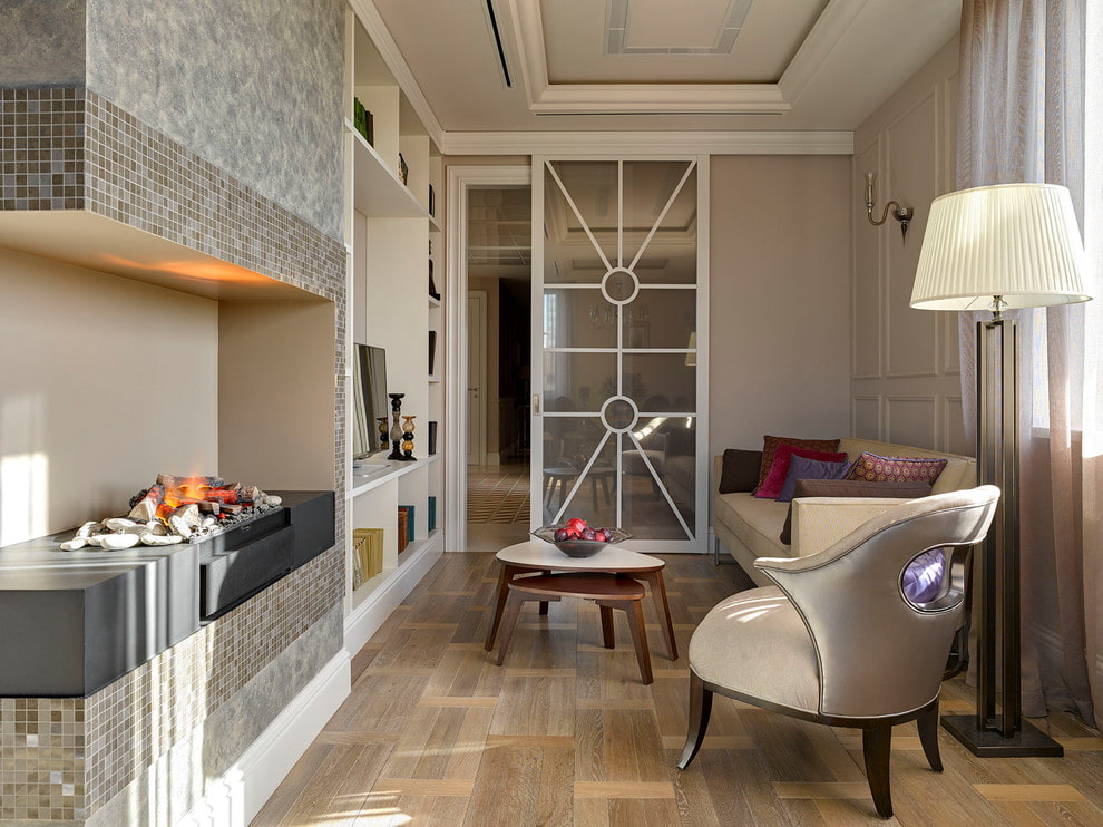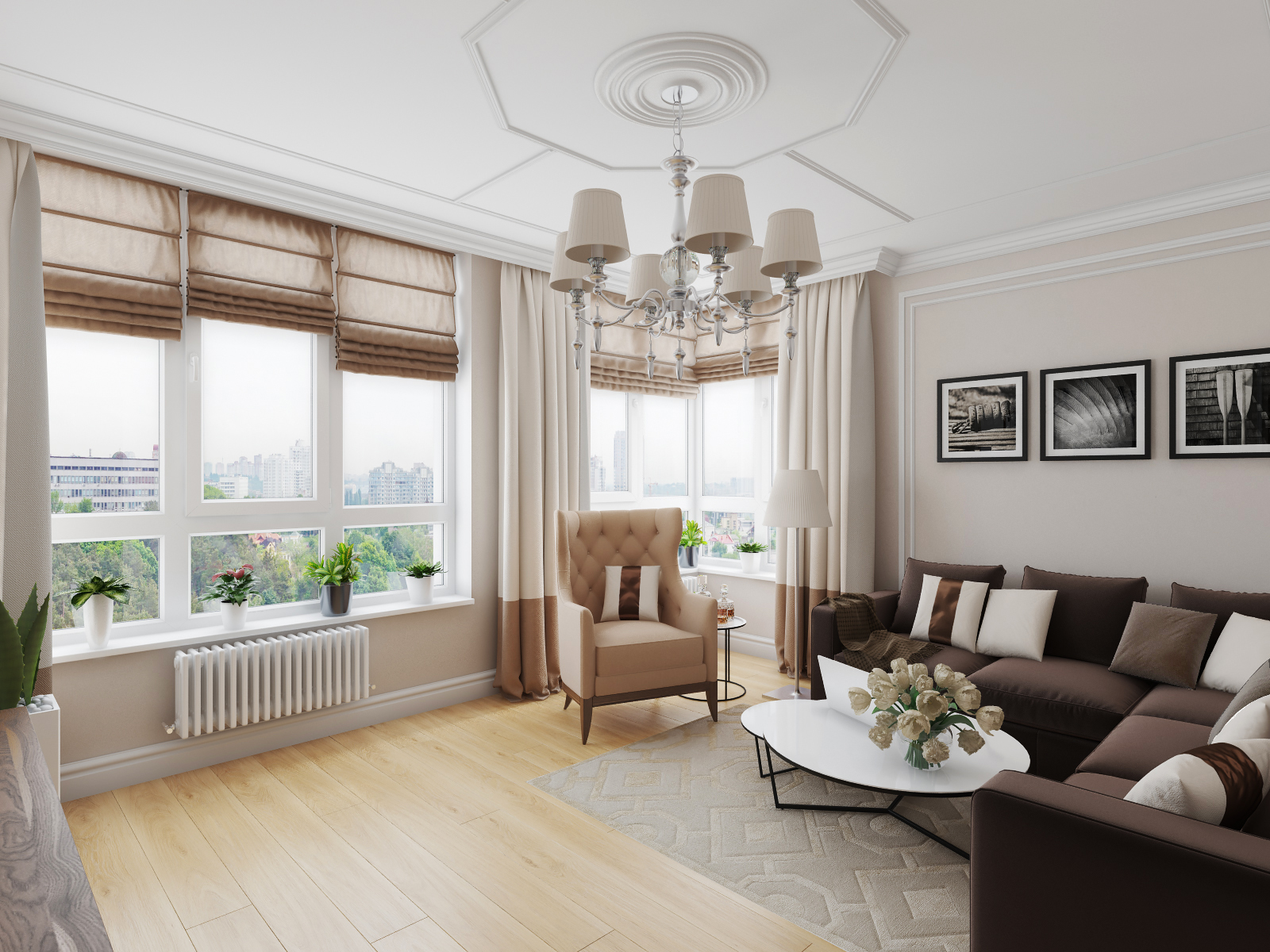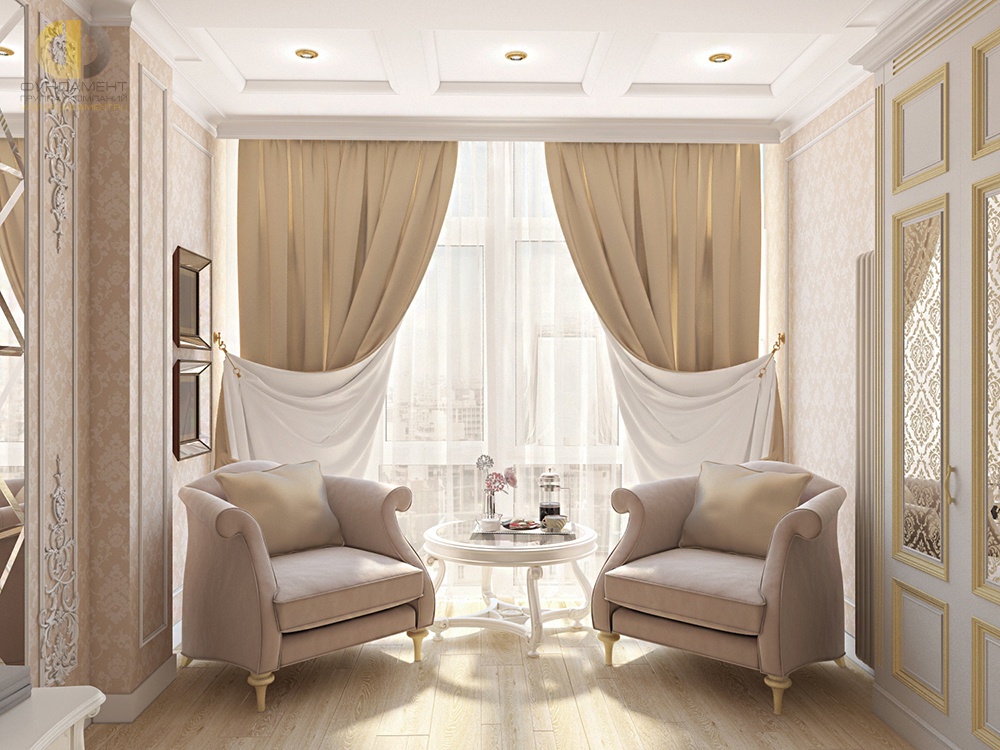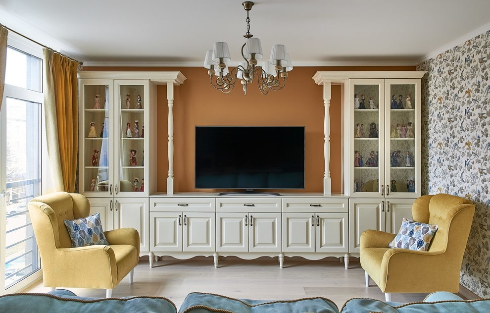 L'appartement, dont le salon est néoclassique, dégage lumière, chaleur et harmonie. Des couleurs claires, des nuances de crème et de beige conviennent à la conception de la salle. Le rôle des points contrastés est joué par le décor du vert, du marron, du rouge, de l'orange. En conséquence, la chambre est associée à une atmosphère de sérénité et de paix.
