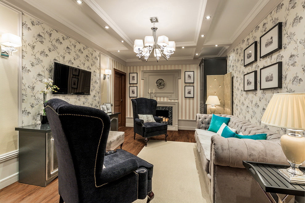 Sur la photo de conception du salon néoclassique, vous pouvez toujours voir un lustre en cristal, dans la conception duquel il y a d'innombrables pendentifs et de petits détails. Pour résister à l'abondance d'éléments décoratifs, choisissez un modèle avec un boîtier solide et durable.