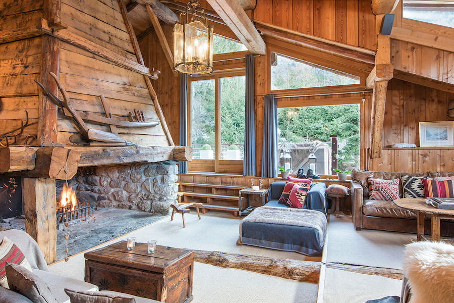 Le confort dans le chalet ajoutera une cheminée, des meubles rembourrés confortables et une lumière ambiante.
