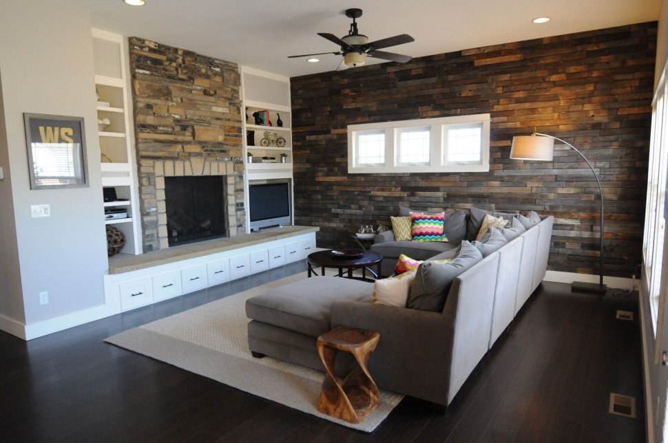 La salle sera décorée d'une cheminée en pierre, autour de laquelle une zone de loisirs avec un canapé massif et une paire de fauteuils peut être aménagée.