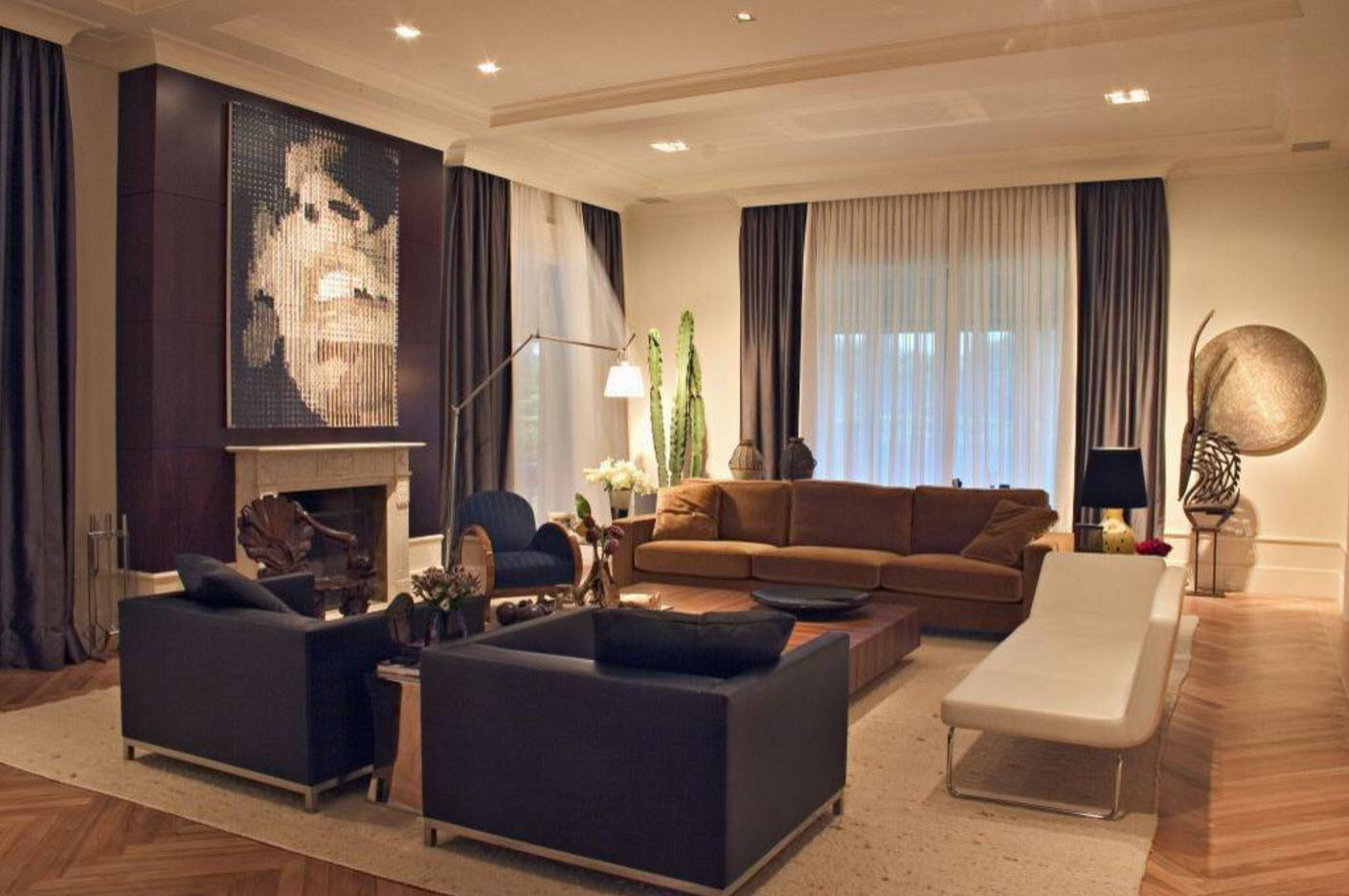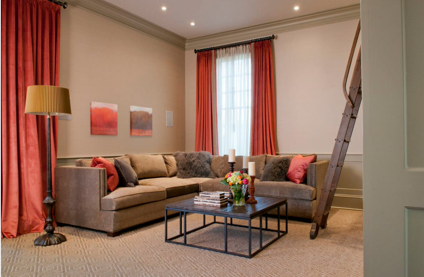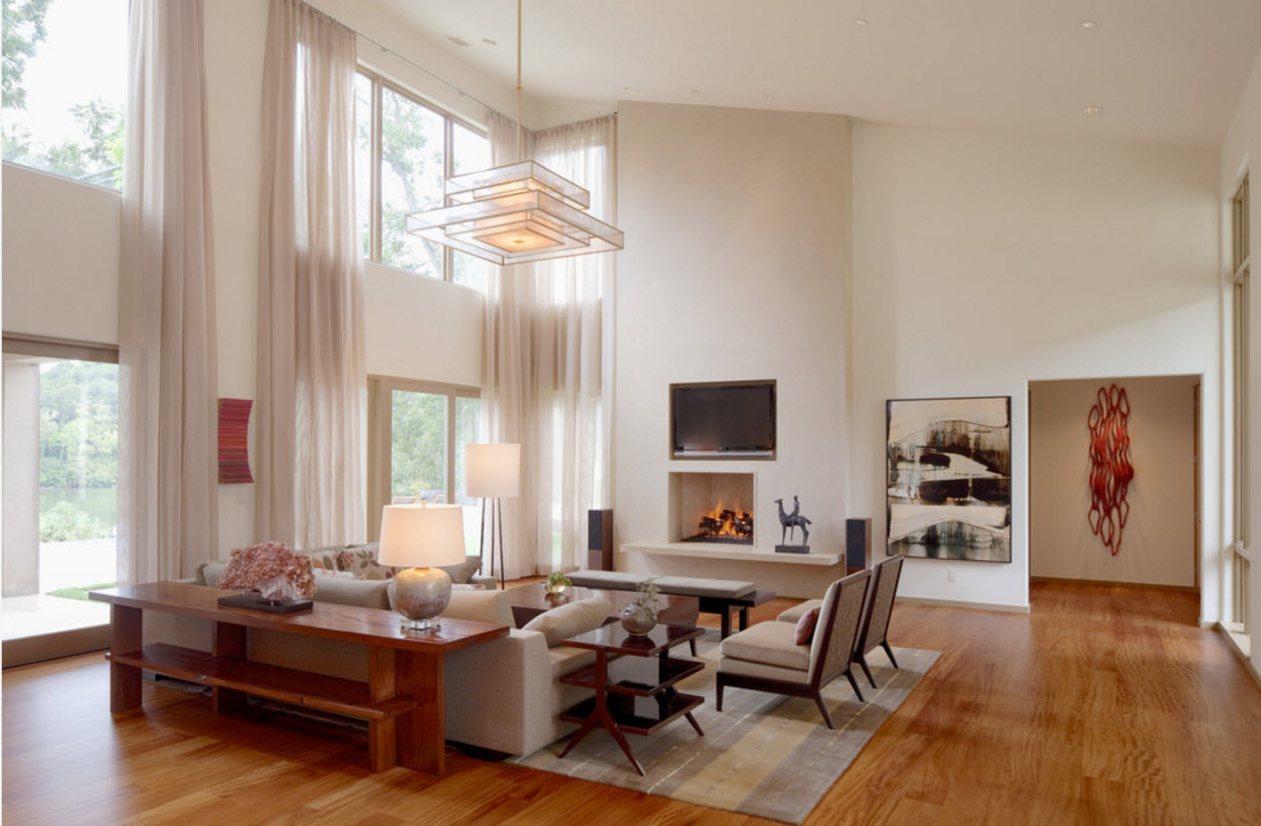 Ayant une composition de rideau du plafond au sol, vous pouvez obtenir une augmentation visuelle de la hauteur du plafond dans le salon.