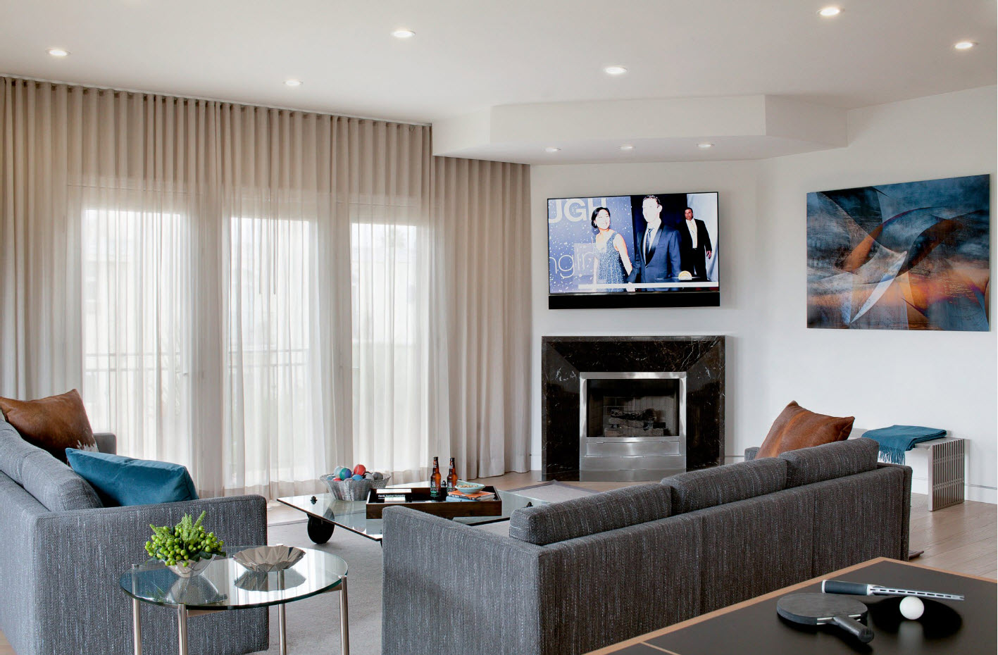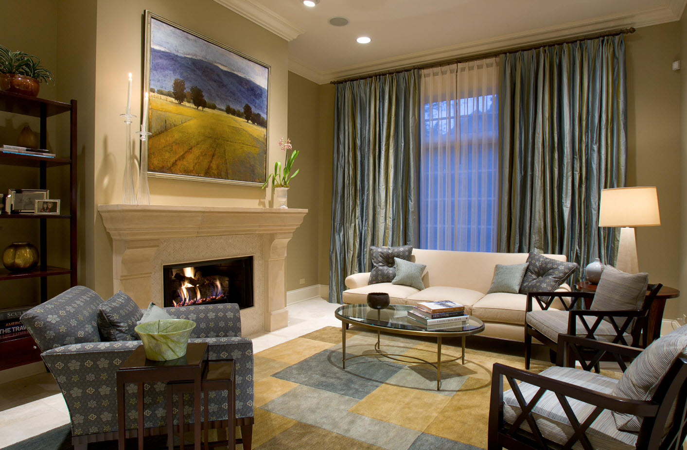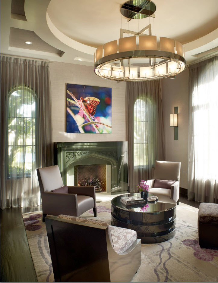 Ayant une composition de rideau du plafond au sol, vous pouvez obtenir une augmentation visuelle de la hauteur du plafond dans le salon.