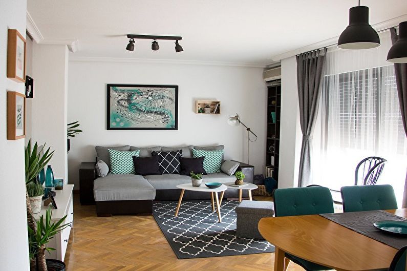 Des pays frais du nord, un style est venu à nous, se distinguant par son naturel, sa praticité et son amour des couleurs vives. Nous vous conseillons d'y prêter attention dans le cas de la décoration intérieure d'un salon étroit, car la palette de couleurs elle-même résout déjà le problème de l'expansion visuelle de la pièce.