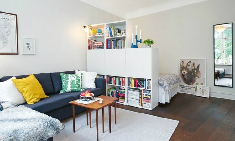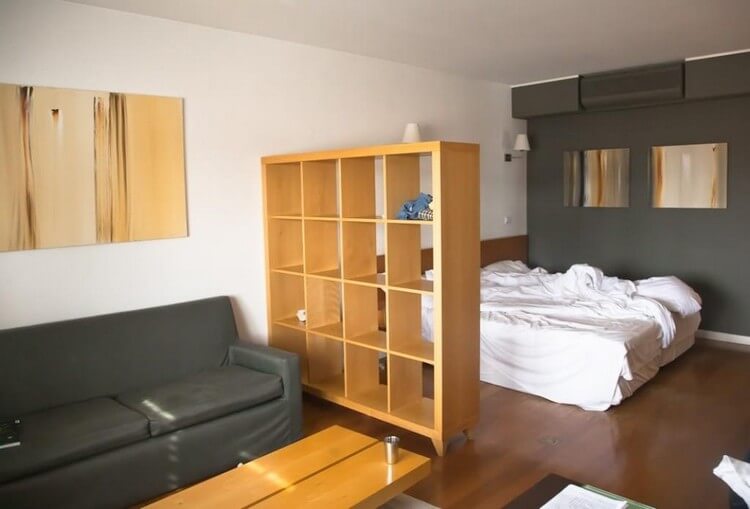 Le zonage des étagères est une option simple et abordable. Le principal avantage de cette partition est l'abondance d'espace pour la bibliothèque personnelle. Parmi les inconvénients, on peut noter la faible hauteur des modèles fabriqués en série et l'installation d'un système supplémentaire de stockage des vêtements.