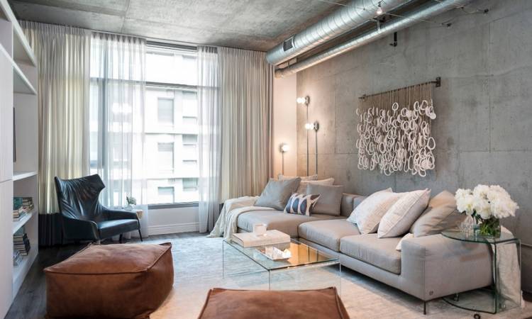 Ici, vous devez utiliser les matériaux de finition les plus simples. Il s'agit d'un panneau non traité ou de son imitation, du plâtre, du béton. Éléments de décoration minimum ou pas du tout. Des couleurs claires sont utilisées - blanc, gris clair, couleur bois naturel.Ils sont teintés et accentués de gris foncé et de noir. L'éclairage est à plusieurs niveaux.