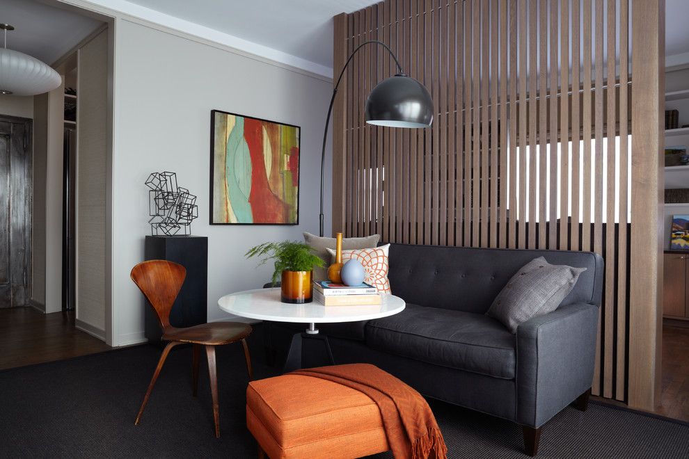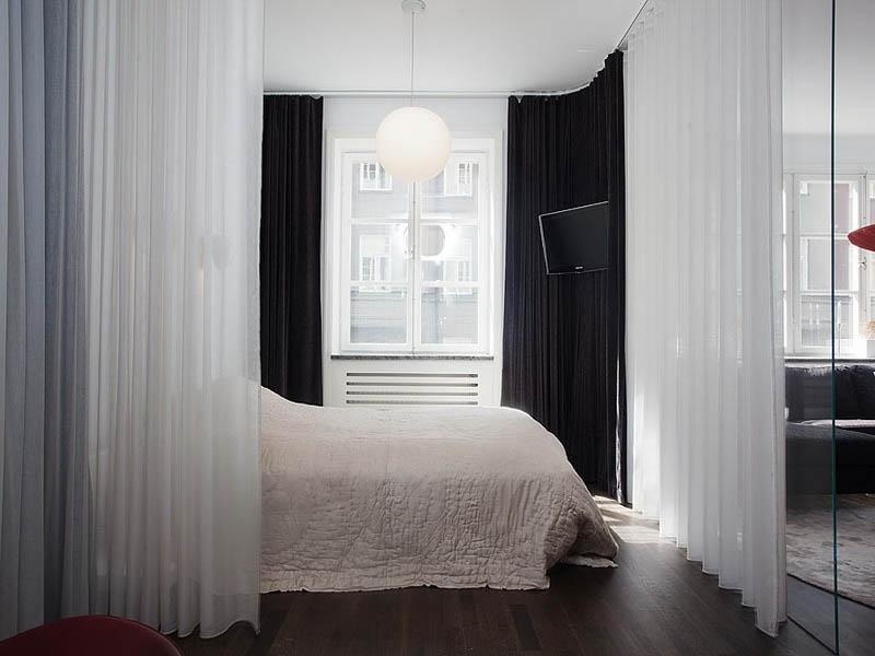 Cette option est souvent utilisée dans les appartements d'une pièce. Pour une séparation correcte de la chambre et de la zone de réception, vous devez utiliser le zonage avec des meubles, de faux murs ou des cloisons. La lumière y contribuera également - dans la zone de couchage, elle est plus douce et étouffée. La chambre est placée plus loin de la sortie.Dans une petite pièce, il n'est pas conseillé de mettre un lit. Un pouf ou un canapé est préférable. S'il y a une niche, la couchette y est placée.