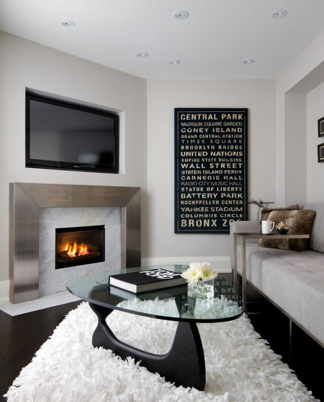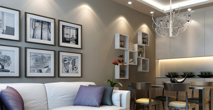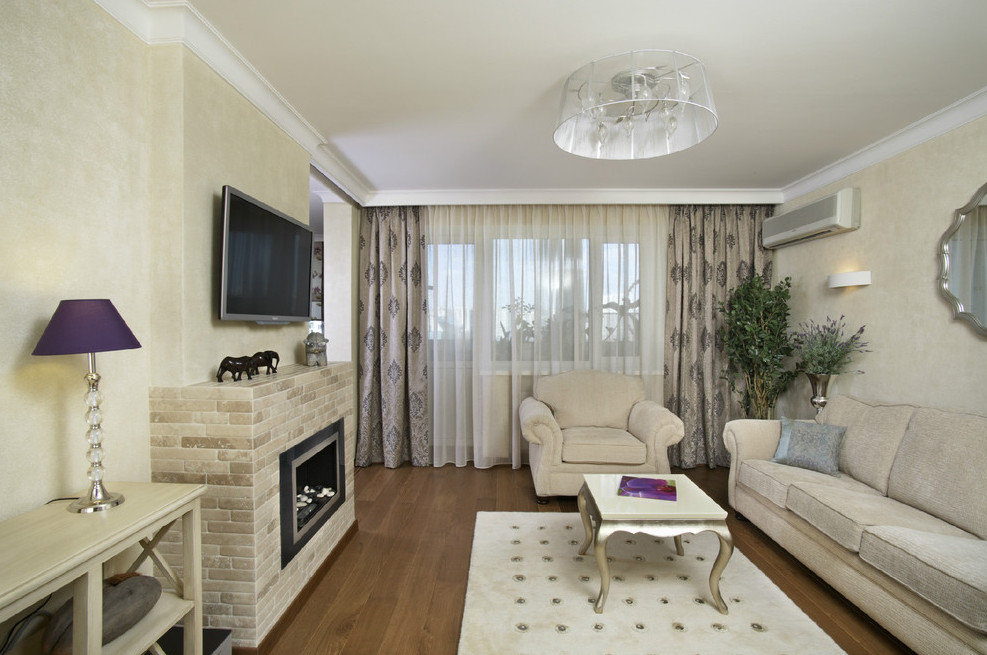 Un lustre massif dans un petit salon se sentira mal à l'aise, il est préférable d'utiliser un éclairage de zone avec de petites lampes et un éclairage décoratif