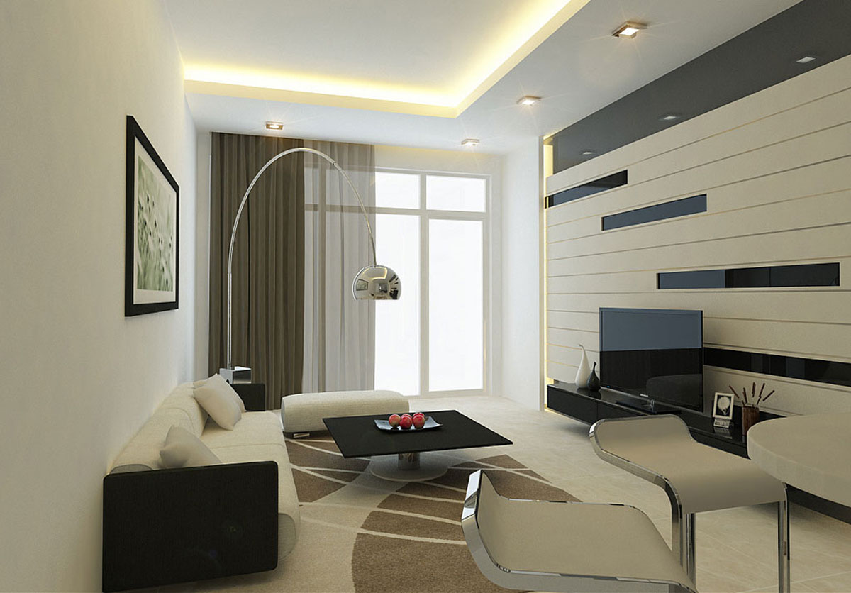 - Le plafond. Si les murs doivent être plus légers que le sol, le plafond doit être plus léger que les murs. Cette règle doit être gardée à l'esprit afin de rendre la pièce plus haute et plus grande visuellement. Pour un petit plafond de salon avec moulures en stuc, plafond à faible allongement, les structures complexes à plusieurs niveaux ne conviennent pas. L'option idéale est un plafond blanc brillant sans éléments décoratifs inutiles.