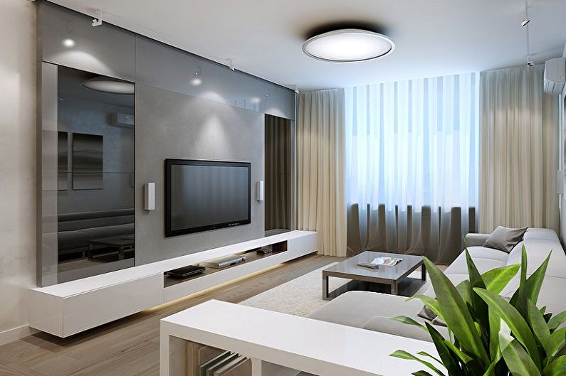 Le salon de ce style comportera des meubles multifonctionnels aux lignes droites et aux formes simples. Décor minimum. Mais en grande quantité, le verre, le miroir et les surfaces brillantes sont utilisés. C'est parfait pour une petite pièce, car il l'agrandira visuellement.