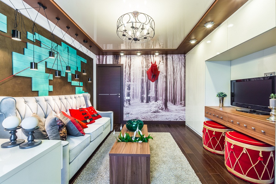 Les garnitures unies, le plafond lisse et brillant, les éléments intérieurs fonctionnels sont préférés. Si le style et le design de la chambre sont correctement choisis, ce sera un endroit confortable pour la détente et les réunions pour toute la famille, et ravira les invités.