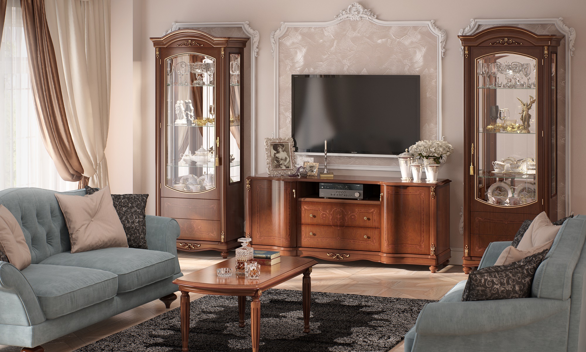 Le mobilier gris s'intègre parfaitement dans l'intérieur néoclassique.