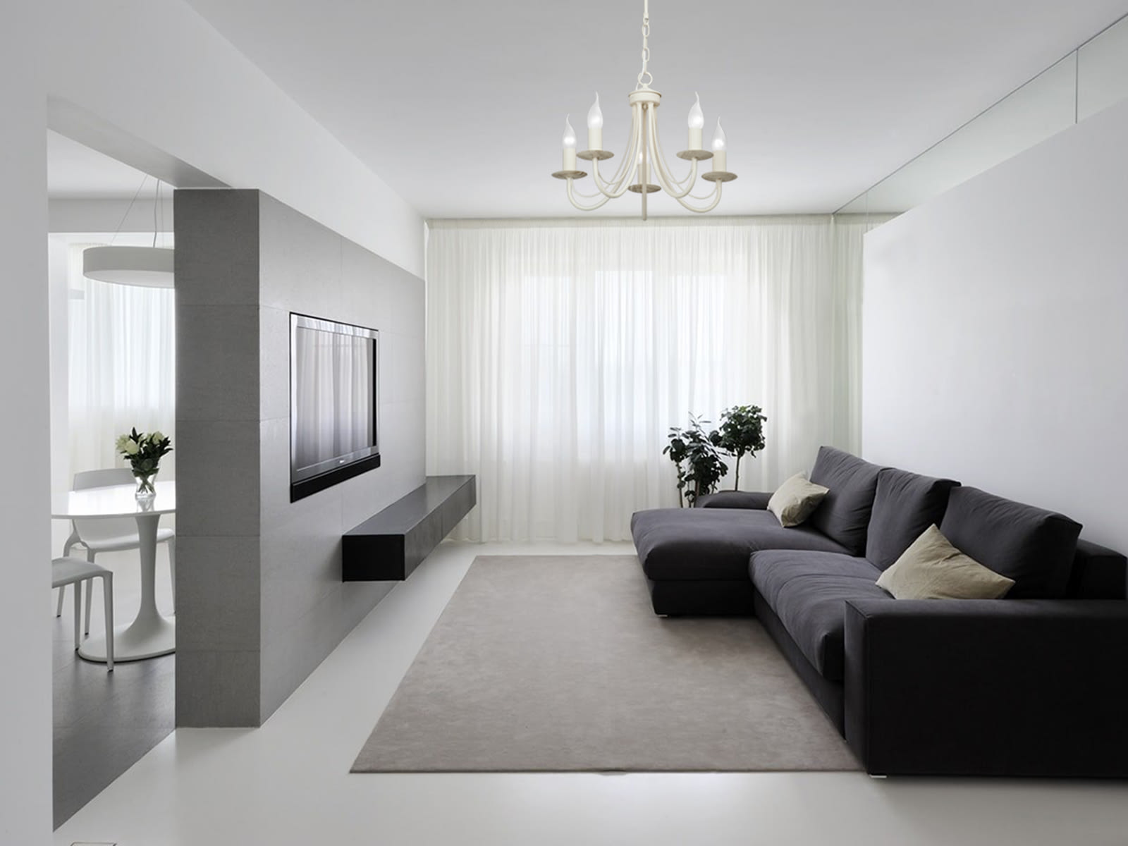 Une option gagnant-gagnant est blanche. Cela rend la pièce aérée et lumineuse. Veuillez noter que cette couleur va bien avec toutes les autres nuances. Mais rappelez-vous: pour que le salon en blanc ne ressemble pas à un hôpital stérile, il doit être dilué avec d'autres couleurs pastel.